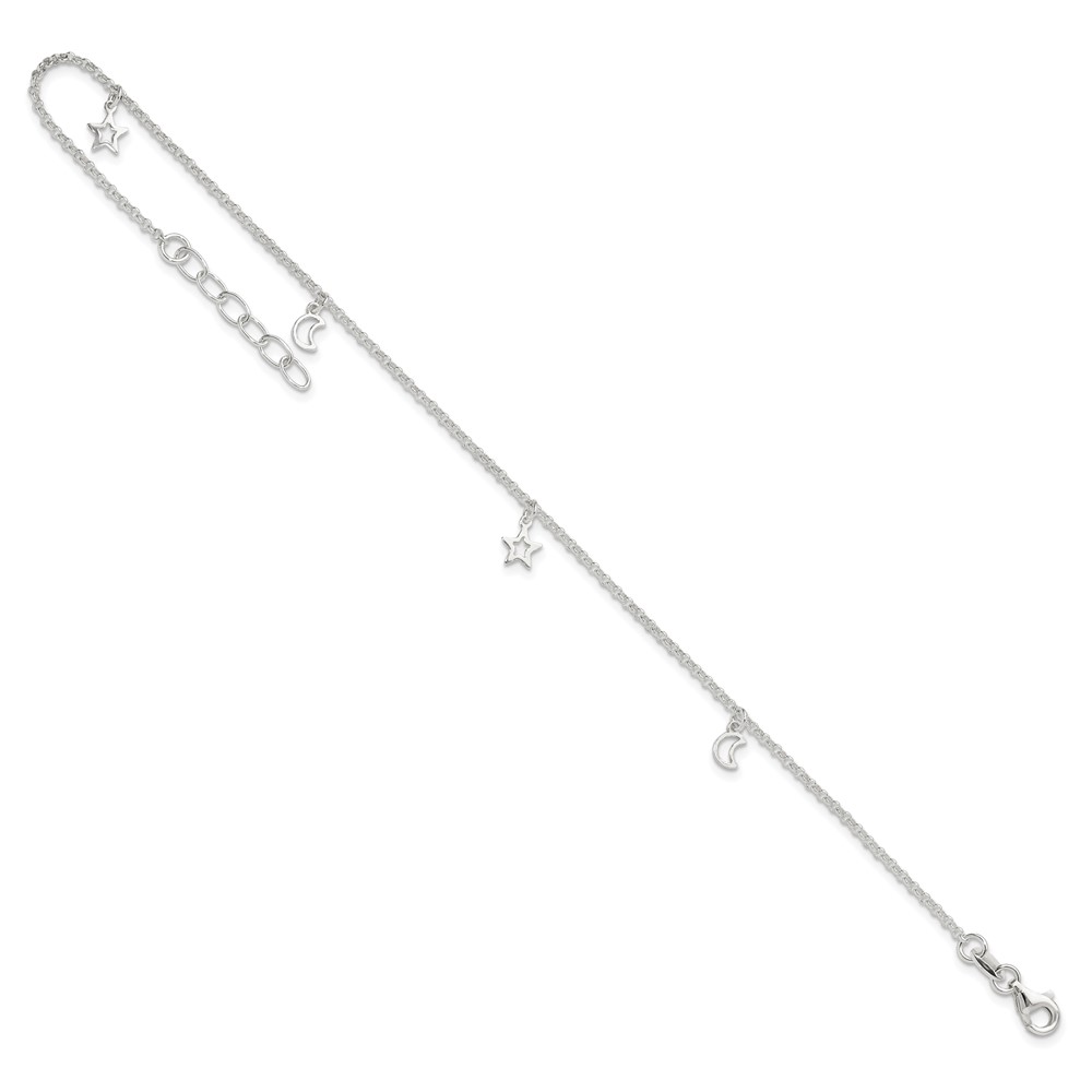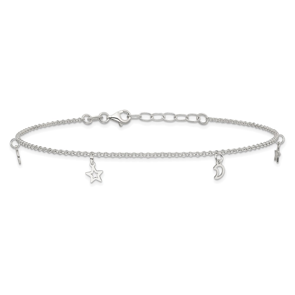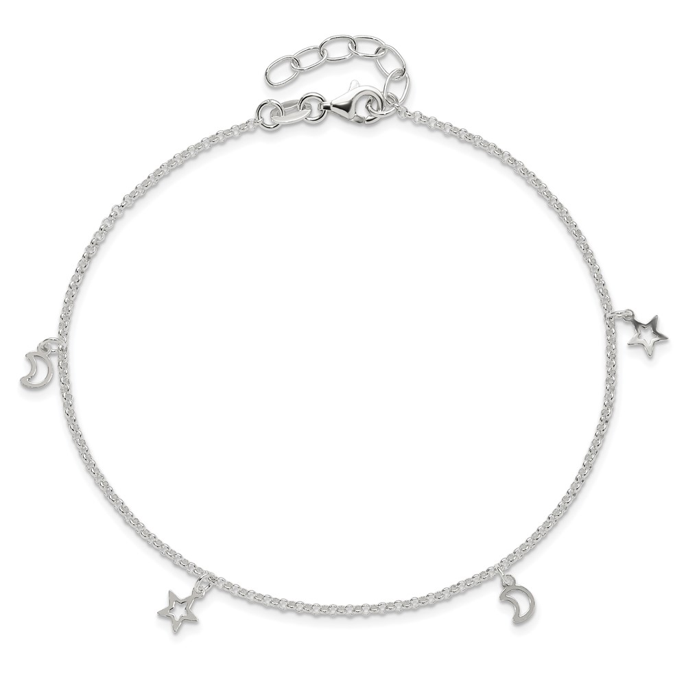 Sterling Silver Moon and Stars 9 inch Plus 1 inch Extender - Total 10 inch Anklet