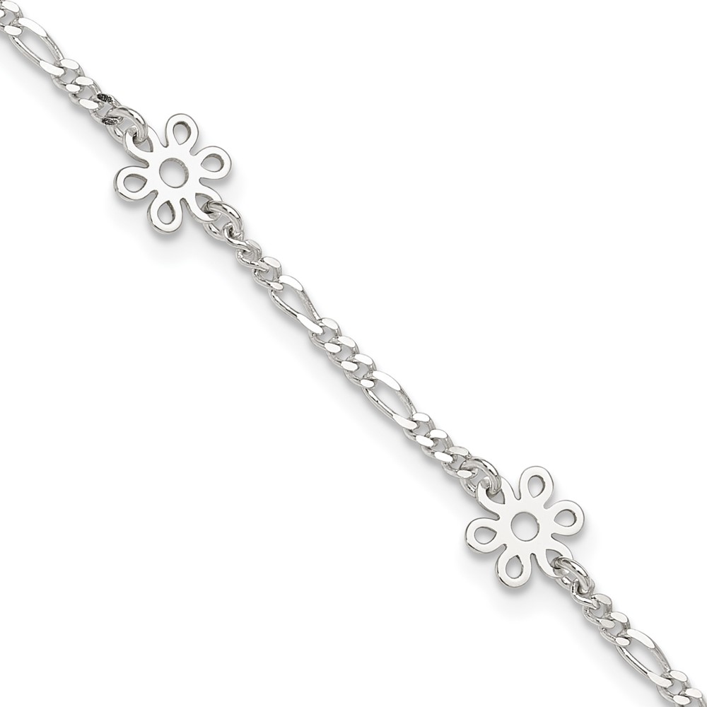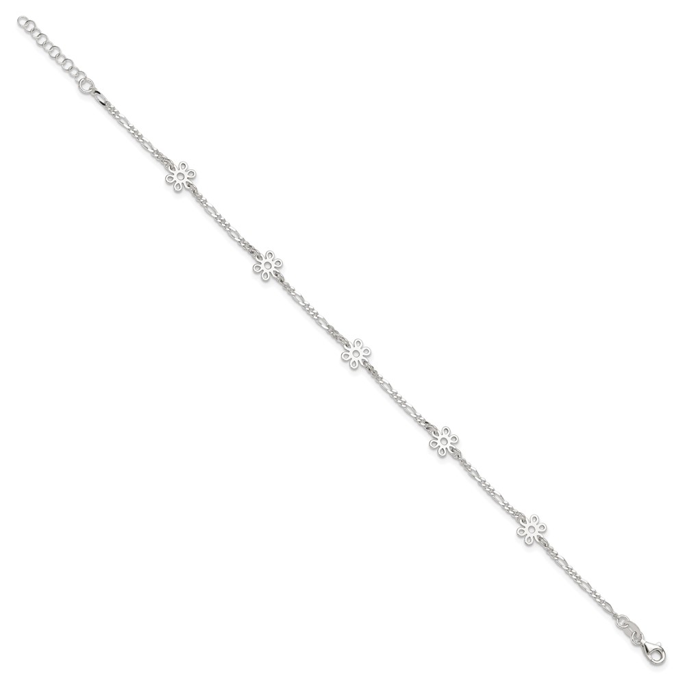 Sterling Silver Figaro Chain/Flowers 5-Station 9 inch Plus 1 inch Extender - Total 10 inch Anklet