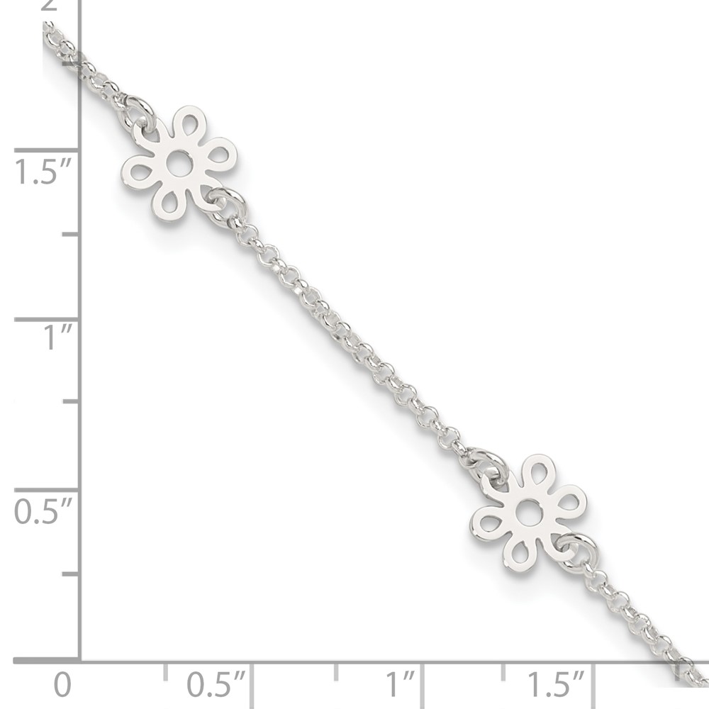 Sterling Silver Cable Chain/Flowers 5-Station 9 inch Plus 1 inch Extender - Total 10 inch Anklet