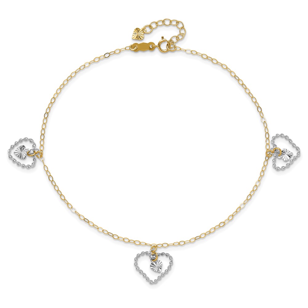 14K Two-tone Twisted Diamond-cut 3 Heart Dangles 9 inch Plus 1 inch Extender - Total 10 inch Anklet