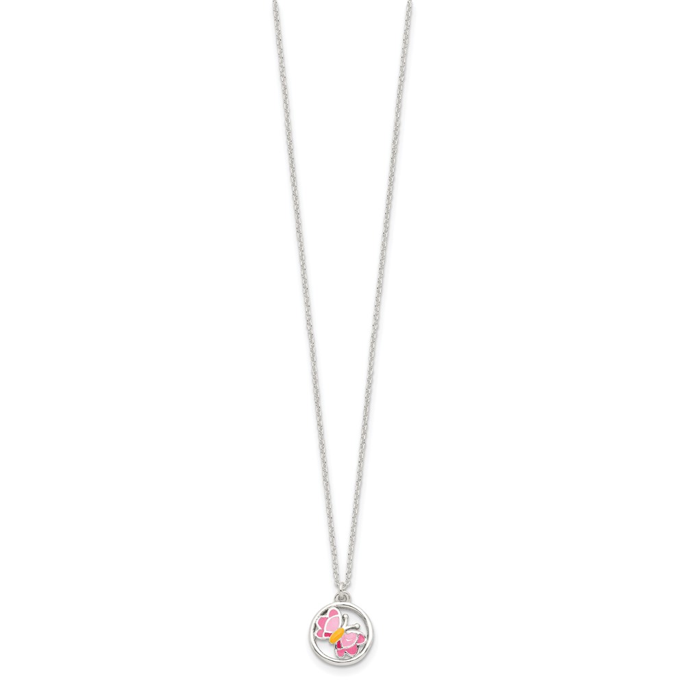 Sterling Silver Polished & Pink/Orange Enameled Butterfly Children's Earrings & 14in Necklace Set