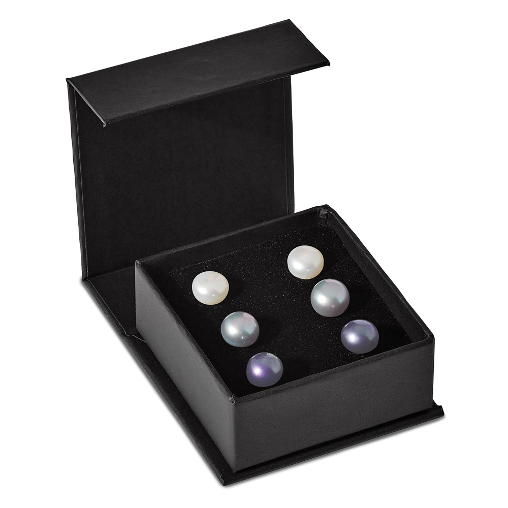 "Sterling Silver Rhodium-plated 8-9mm Black, White and Grey Button Freshwater Cultured Pearl Set of 3 Post Earrings "