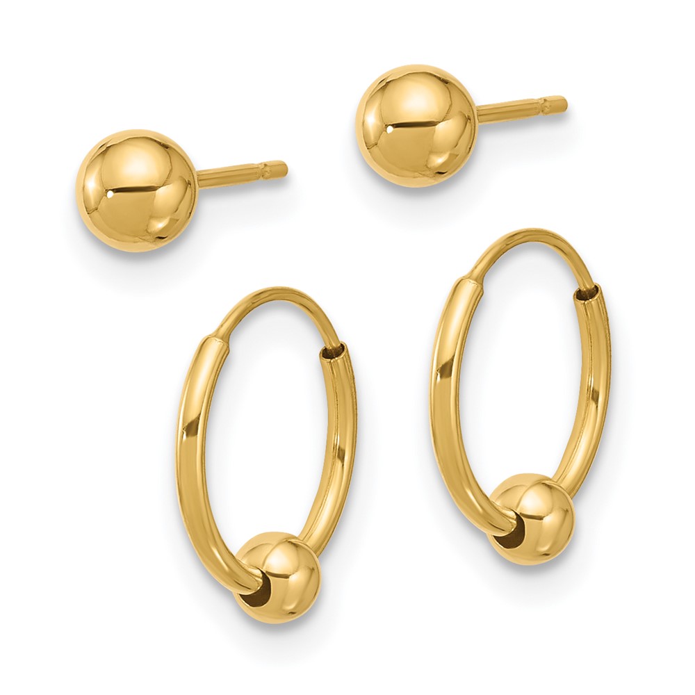 14K Set of Two Pair Polished 4mm Ball and Beaded Endless Hoop Earrings
