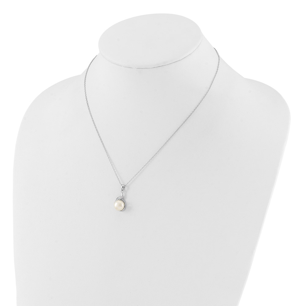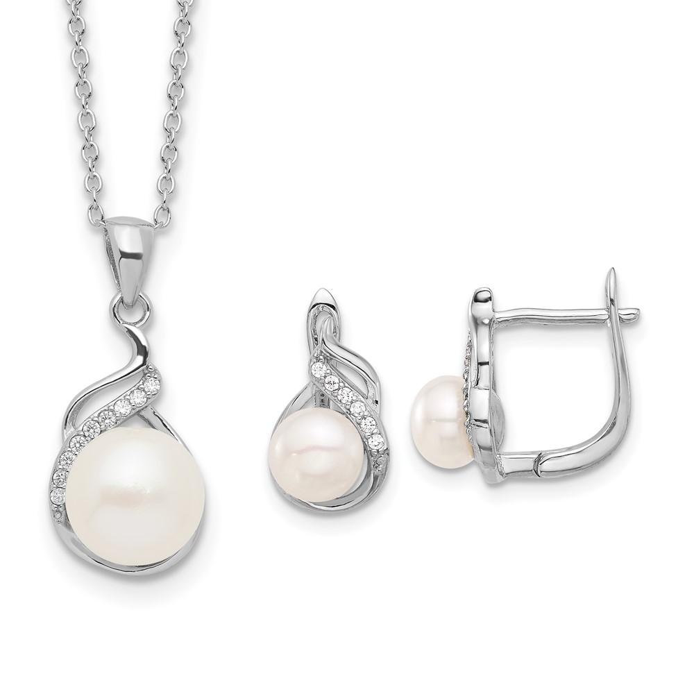 Sterling Silver Rhodium-plated 6-9mm White Button Freshwater Cultured Pearl and CZ 17 inch Necklace and Leverback Earrings Set