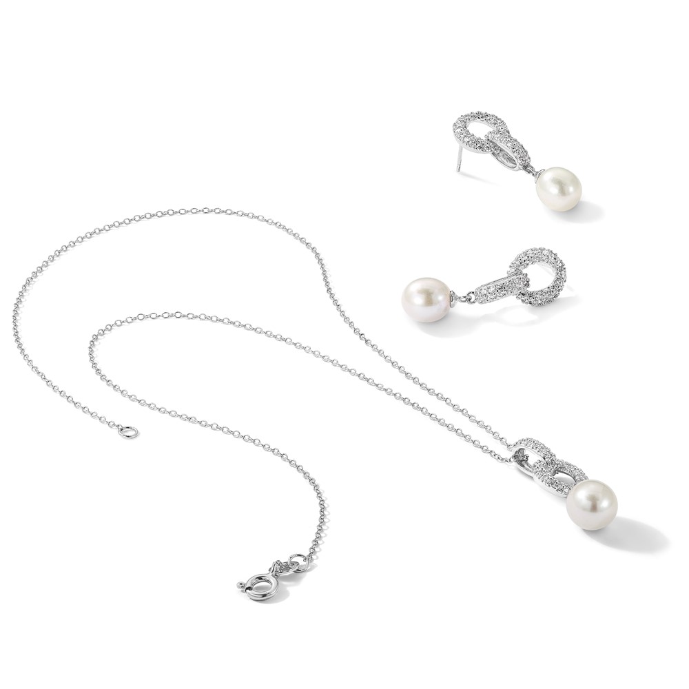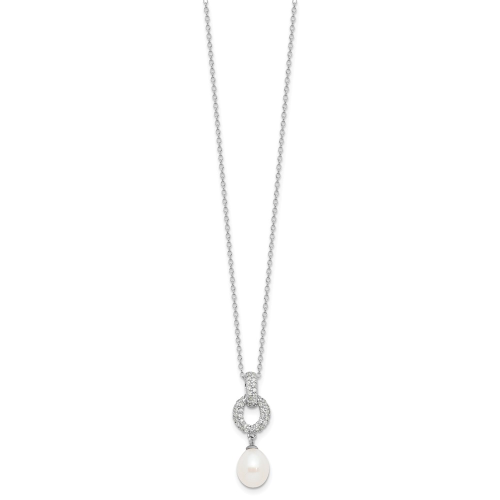 Sterling Silver Rhodium-plated 7-9mm White Teardrop Freshwater Cultured Pearl and CZ 17 inch Necklace and Post Dangle Earrings Set