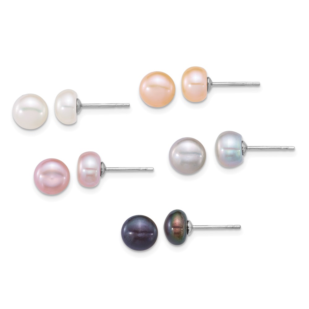 Sterling Silver Rhodium-plated 7-8mm Button White/Pink/Peach/Grey/Black Freshwater Cultured Pearl 5-Pair Boxed Earring Set