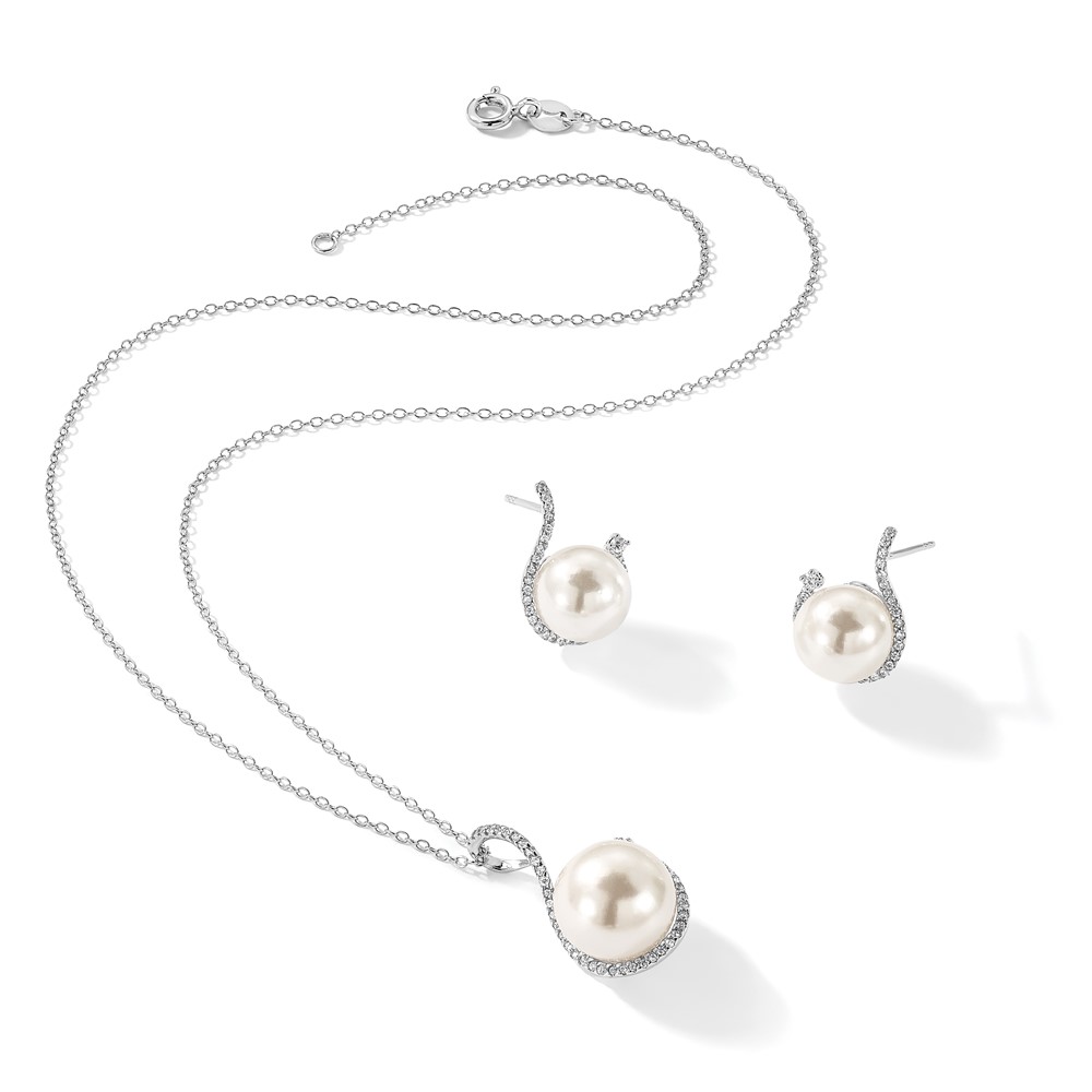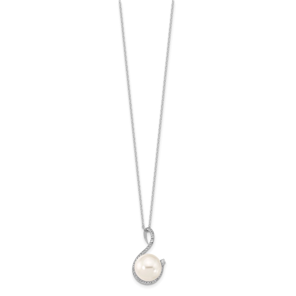 Majestik Sterling Silver Rhodium-plated 10-12mm White Imitation Shell Pearl and CZ Earrings and Spring Ring Clasp 17 inch Necklace Set