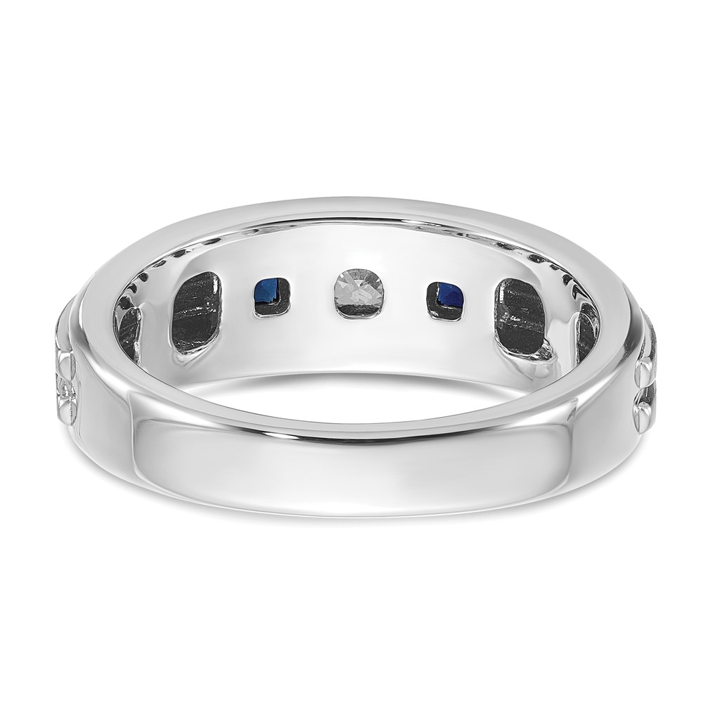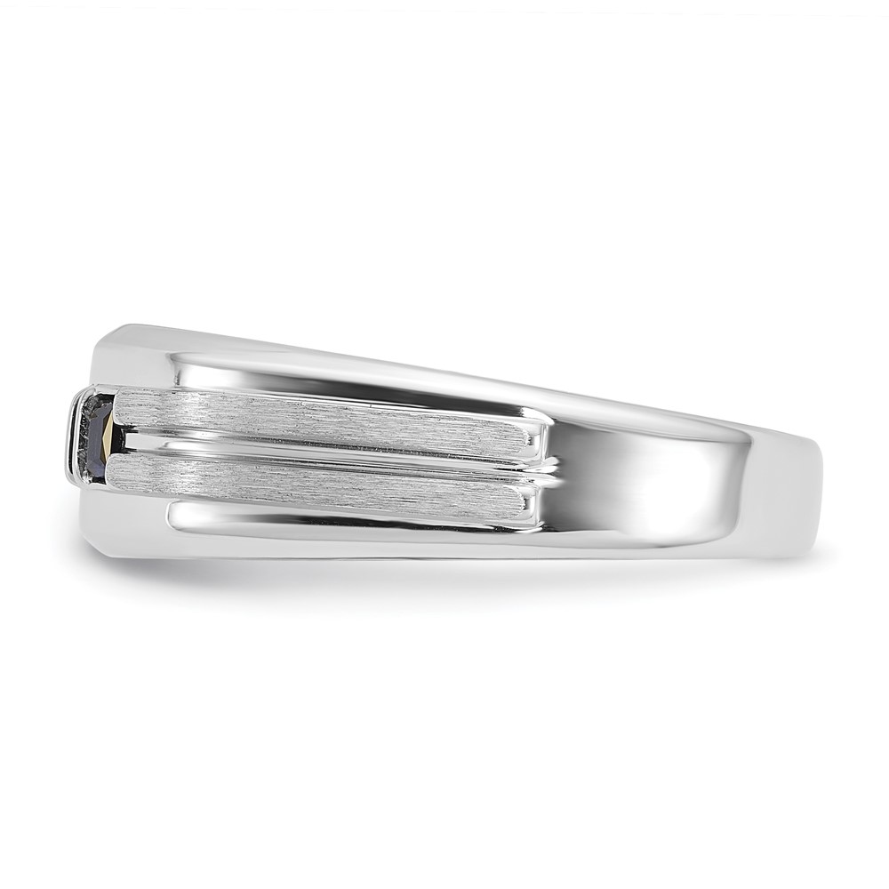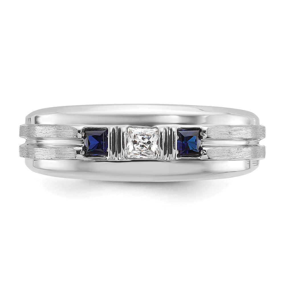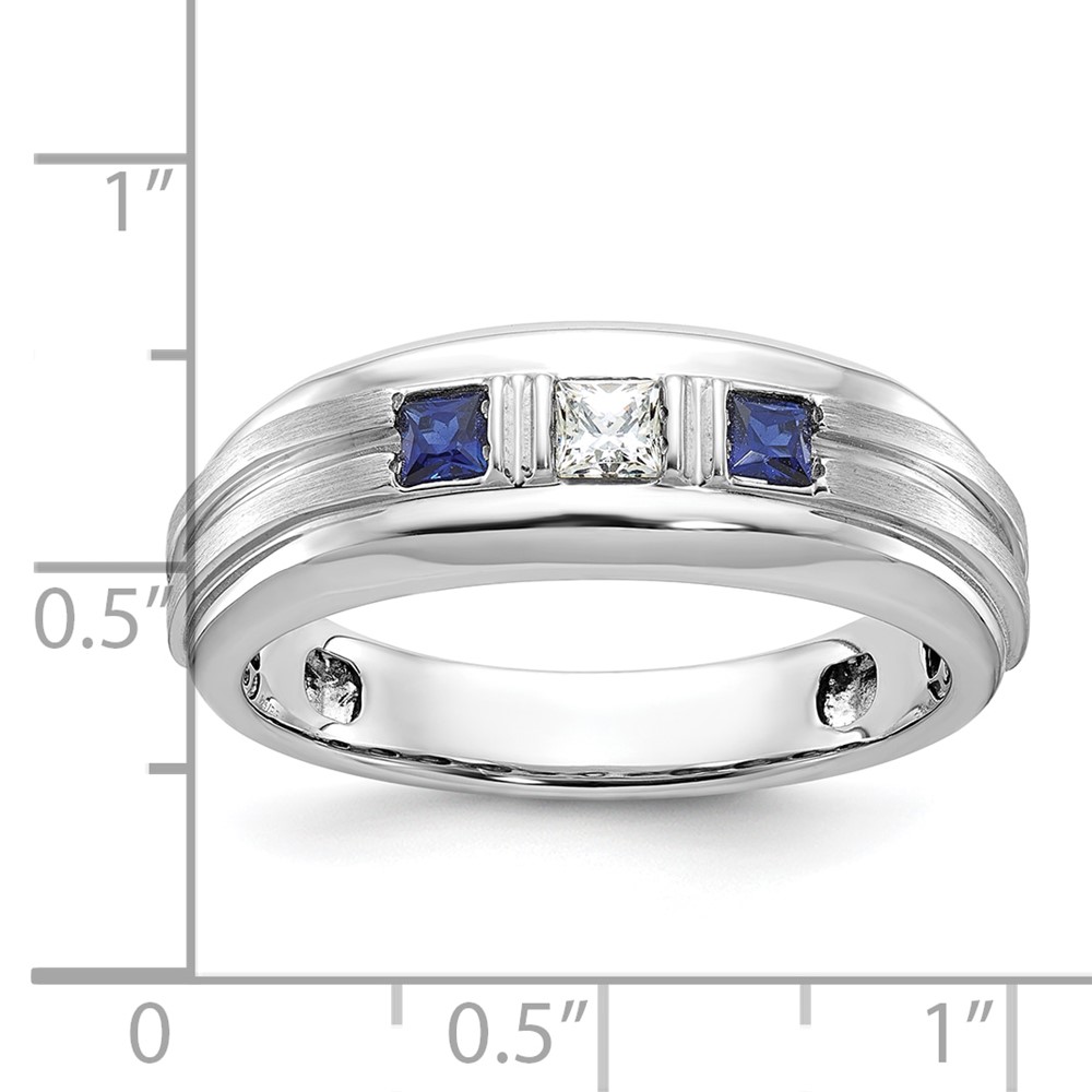 IBGoodman 14k White Gold Men's Polished Satin and Grooved Square 1/6 Carat AA Quality Diamond and Lab Created Sapphire 3-Stone Ring