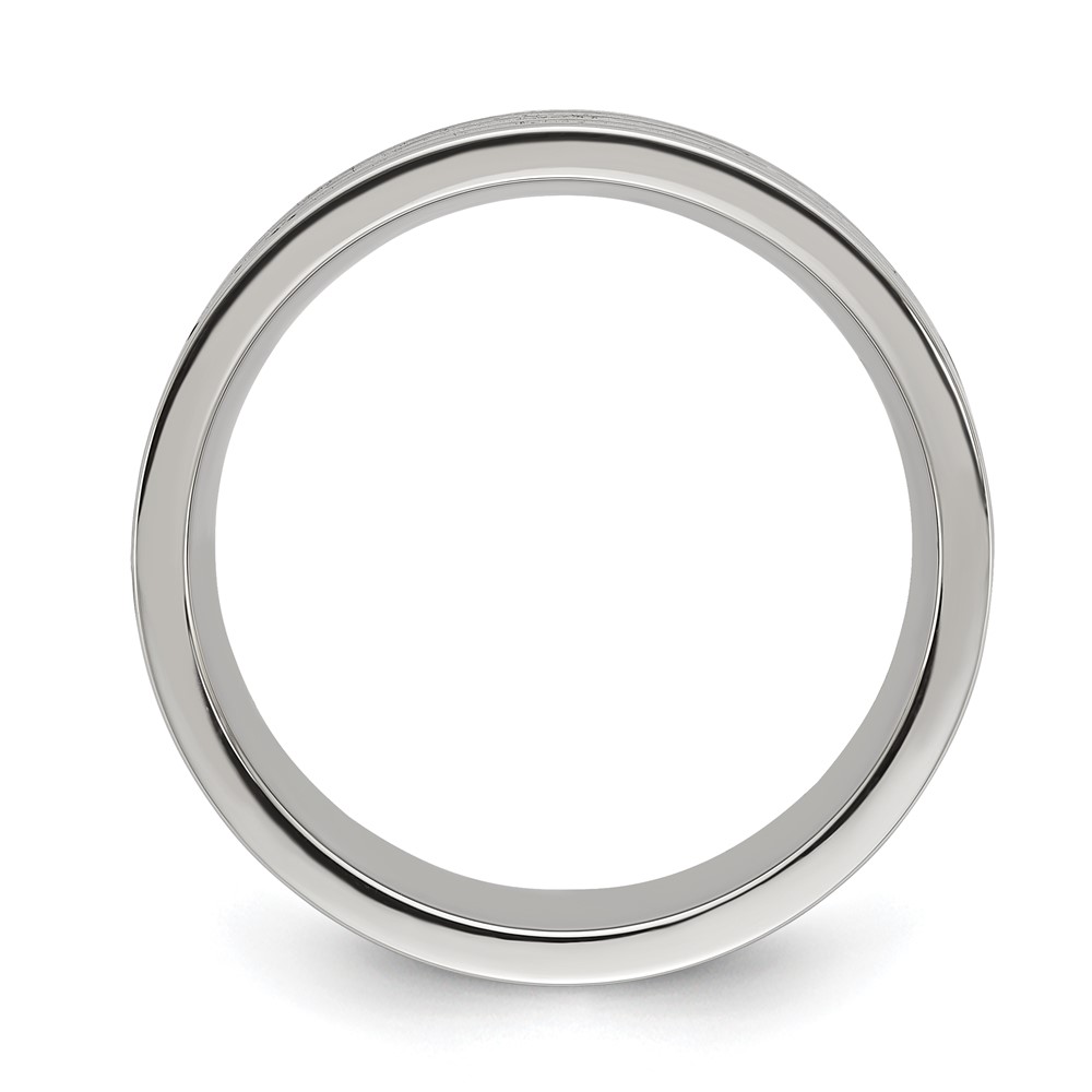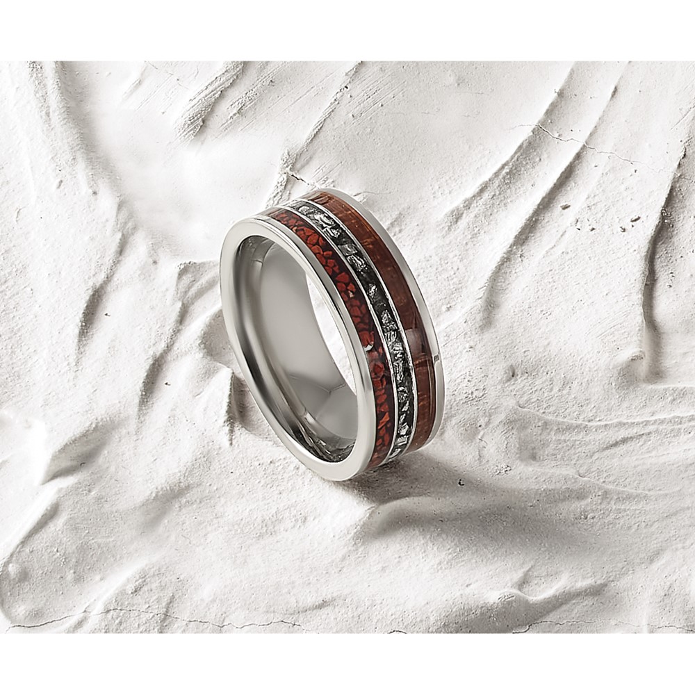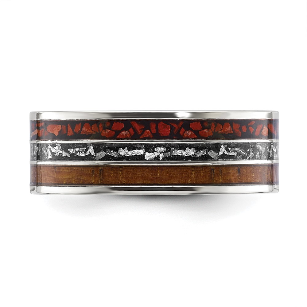 "Chisel Titanium Polished with Wood, Imitation Meteorite and Red Stone Inlay 8mm Band"