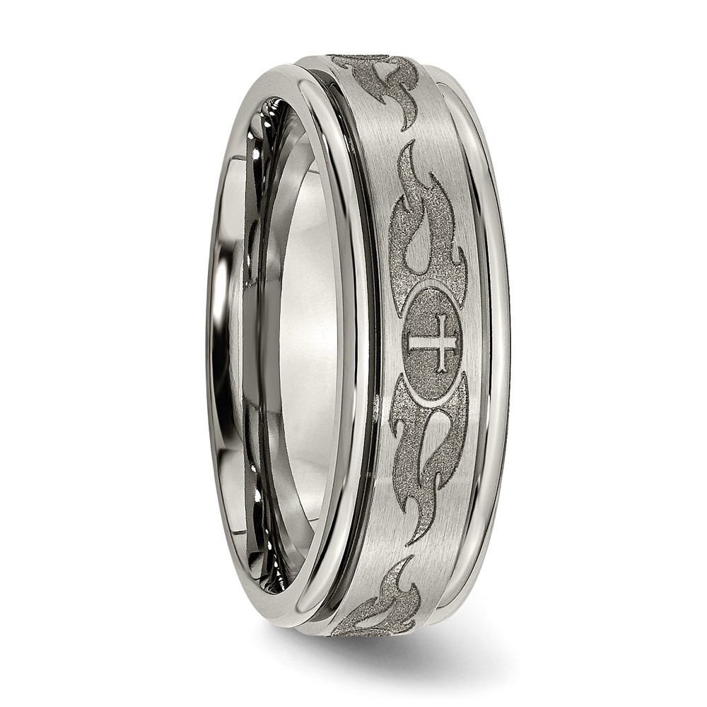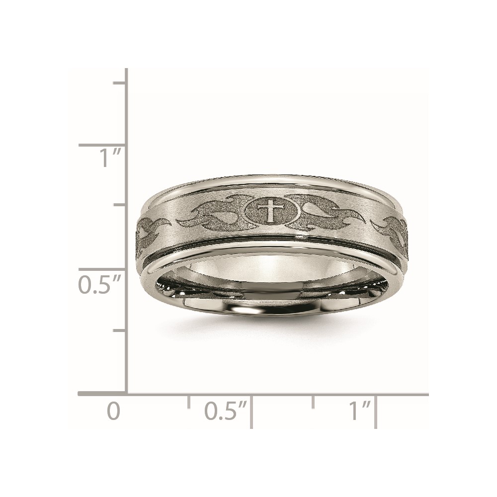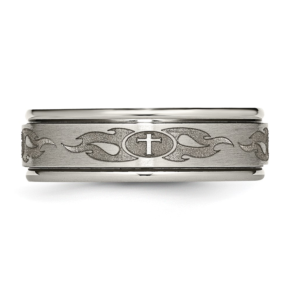 Chisel Titanium Brushed and Polished Cross Laser Design 8mm Ridged Edge Band