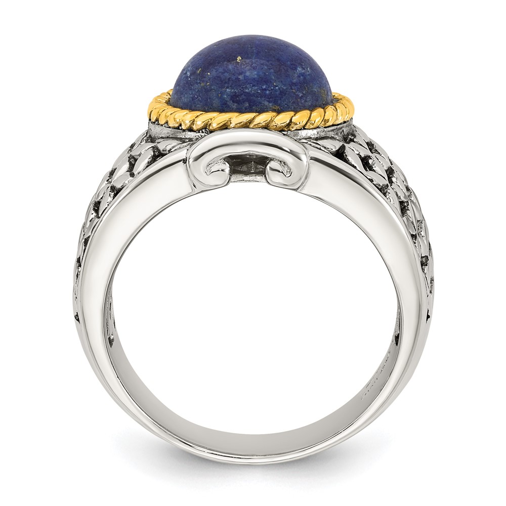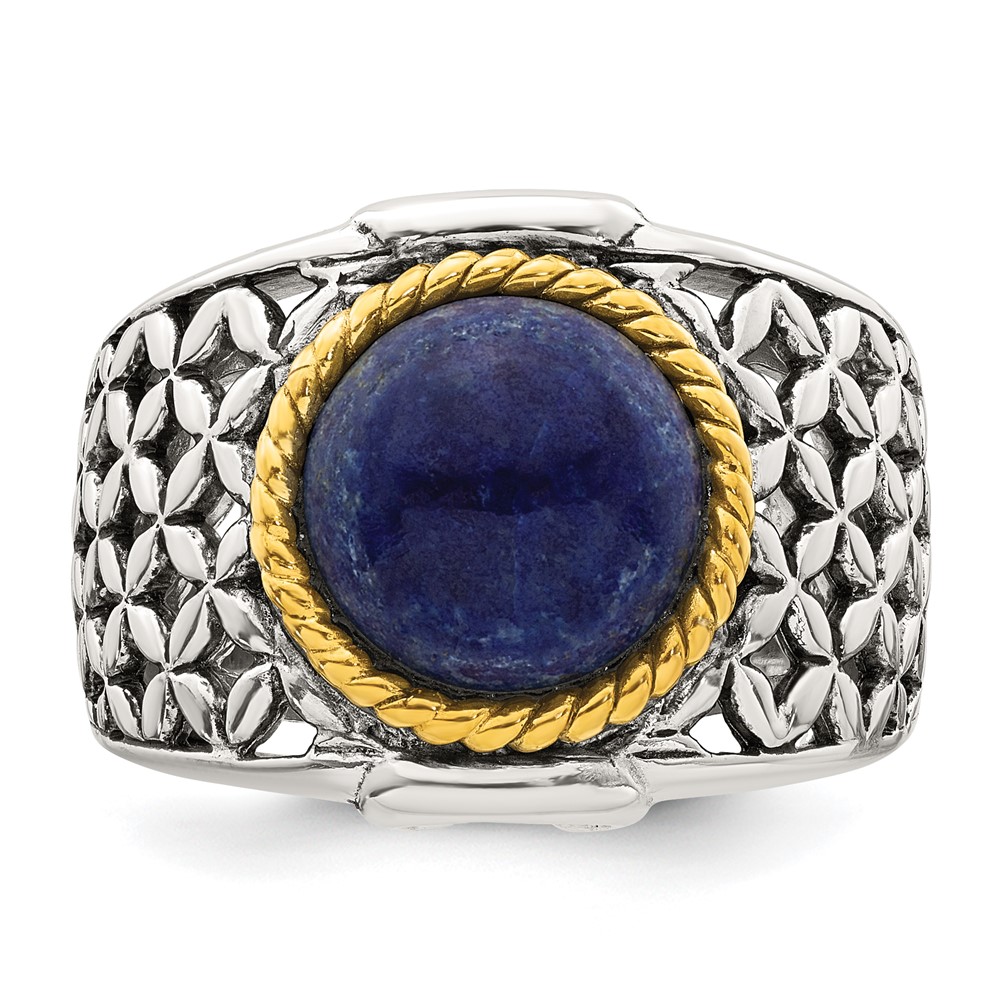 Sterling Silver Antiqued with Gold-plated Accent Polished Round Lapis Cabochon Woven Pattern Ring