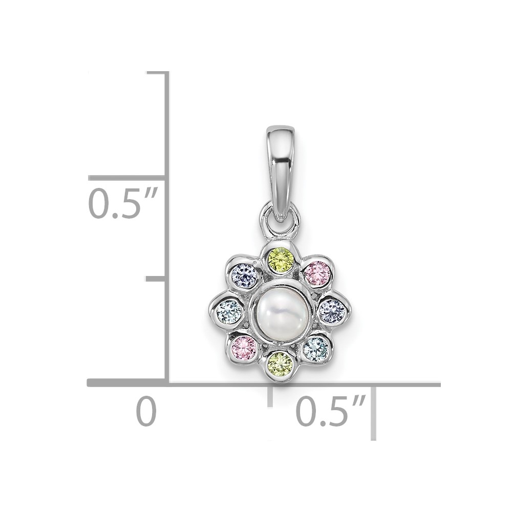 "Sterling Silver Rhodium-plated Polished Green, Pink, Blue and Purple CZ and Freshwater Cultured Pearl Flower Pendant"