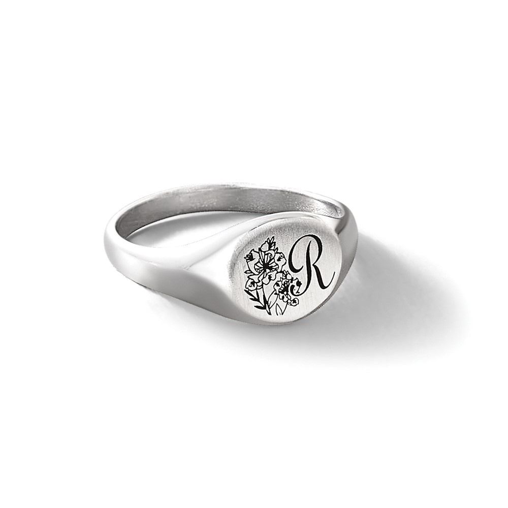SS/Rhodium-plated Epoxy Initial and Birth Flower Signet Ring