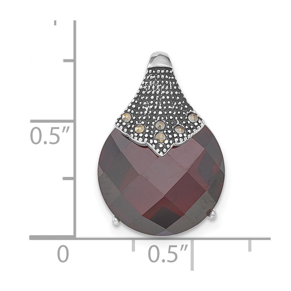 Sterling Silver Polished & Antiqued Red CZ & Marcasite Chain Slide Pendant