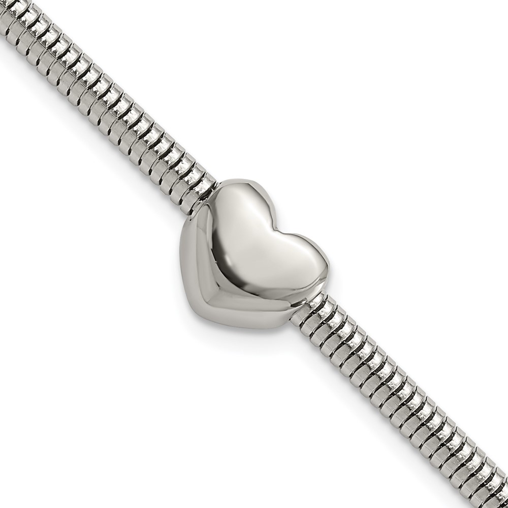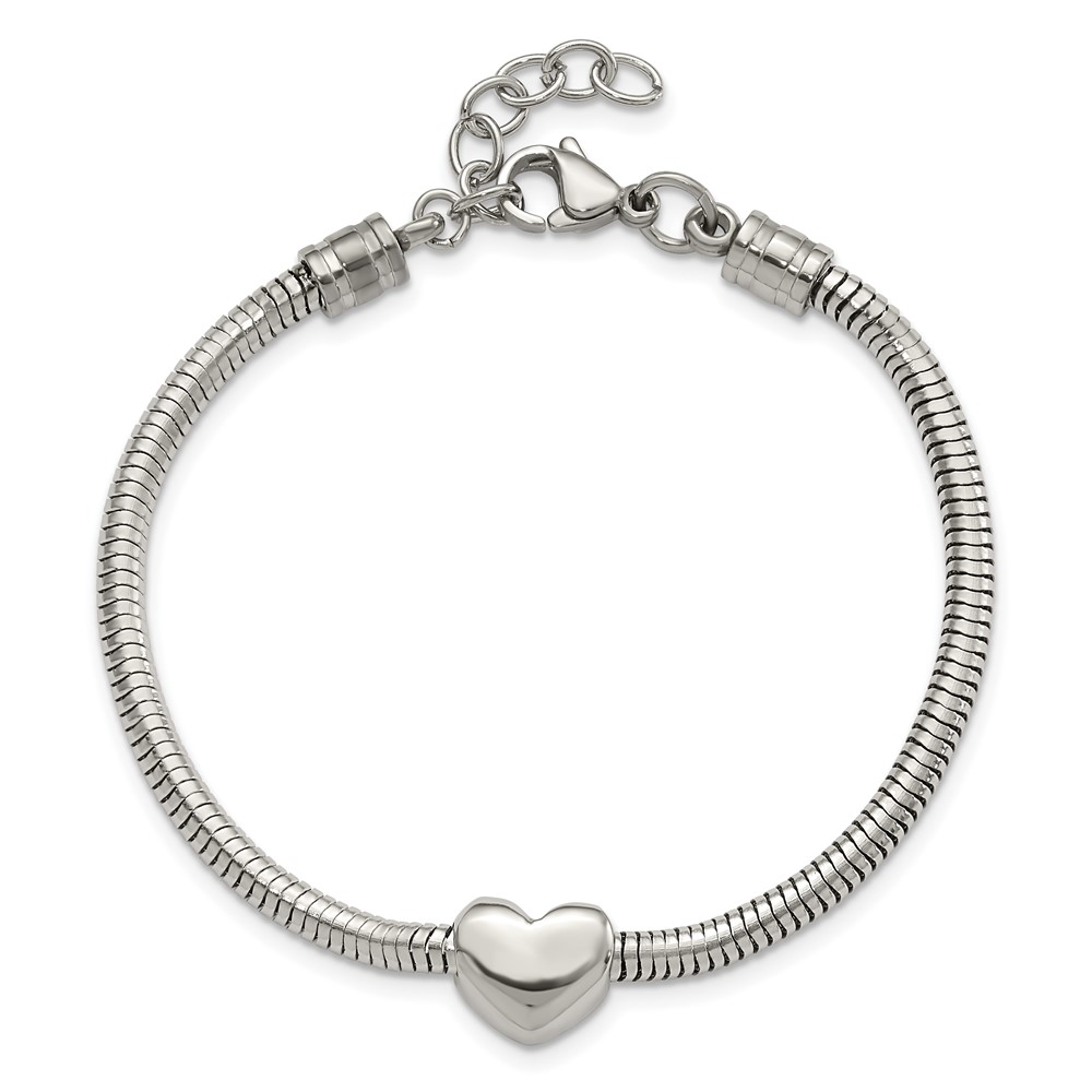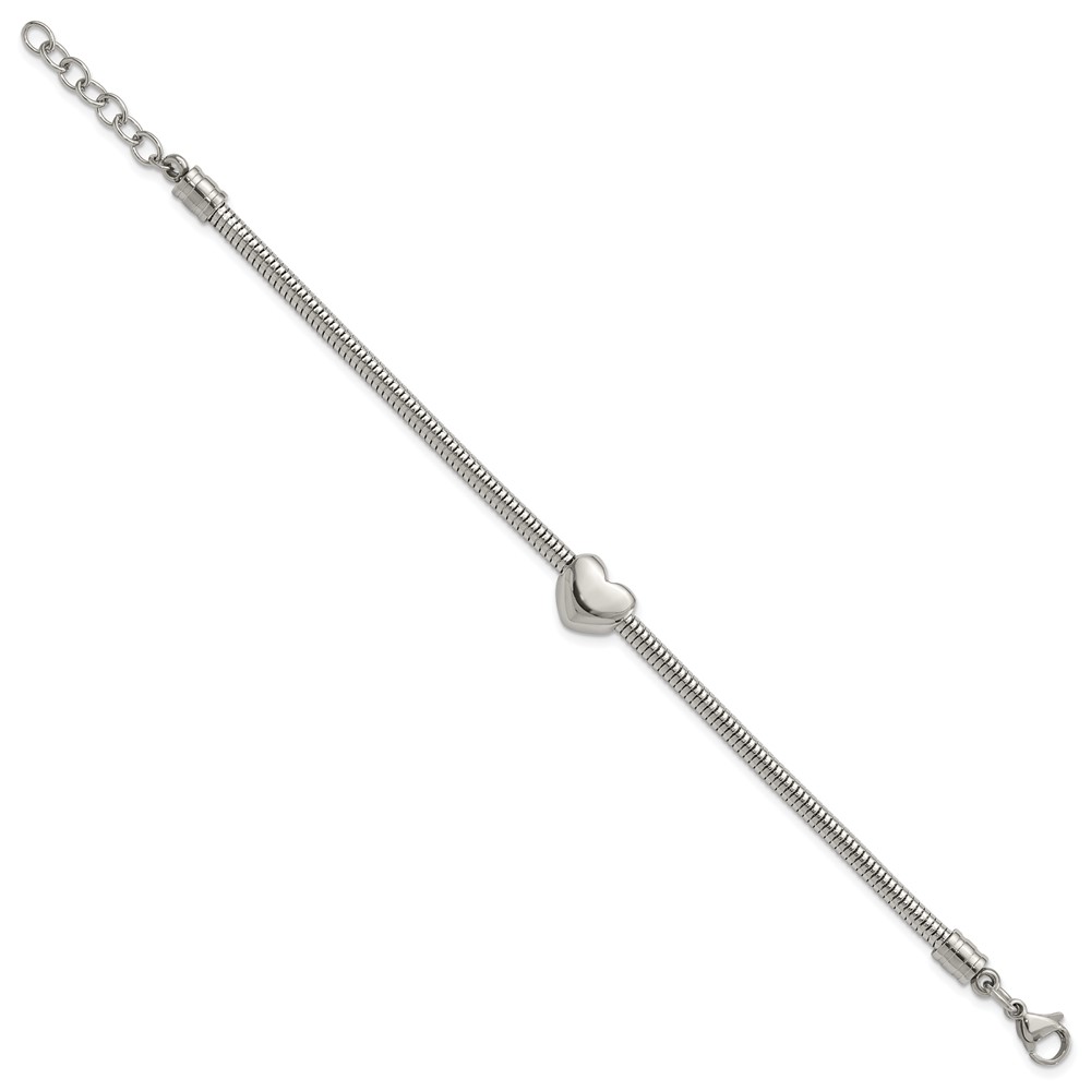 Stainless Steel Polished Heart Bead Snake Chain with 1in ext. Bracelet