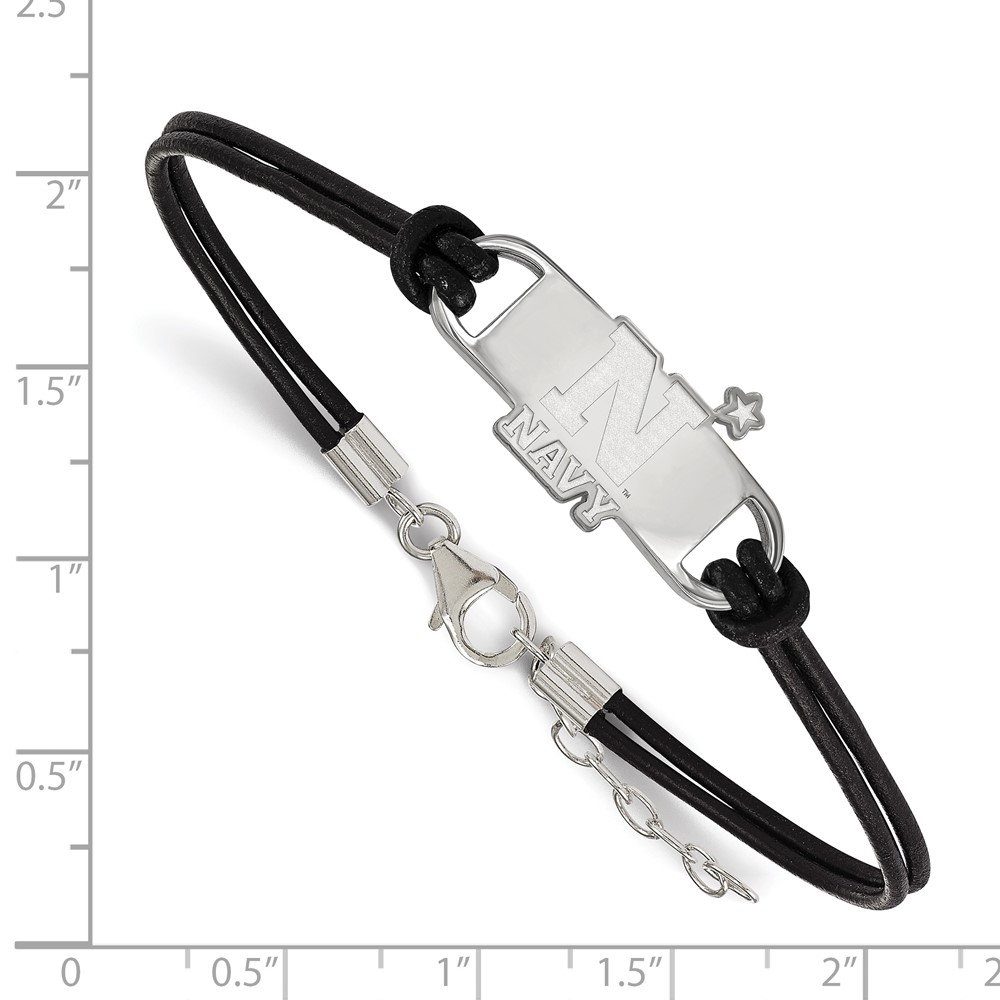 Sterling Silver Rhodium-plated LogoArt US Naval Academy Small Center Black Leather 7 inch Bracelet with Extender