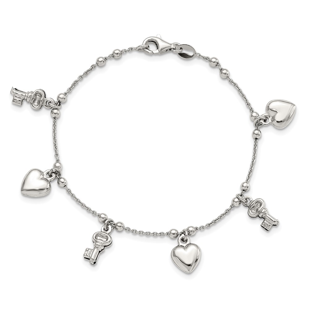 Sterling Silver Rhodium-plated Heart and Key Dangle 6.75in Bracelet