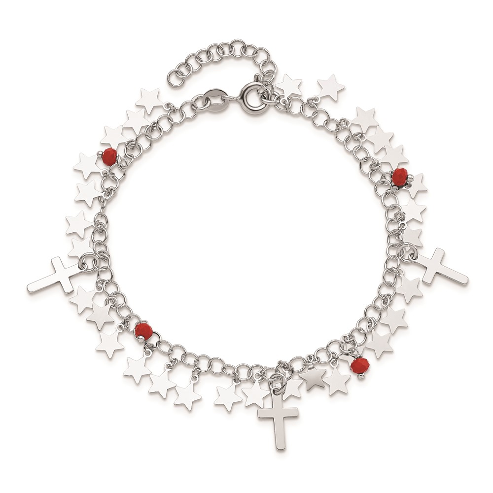 Sterling Silver Rhodium-plated Red Crystal Cross and Star w/ 1.25in ext. Br