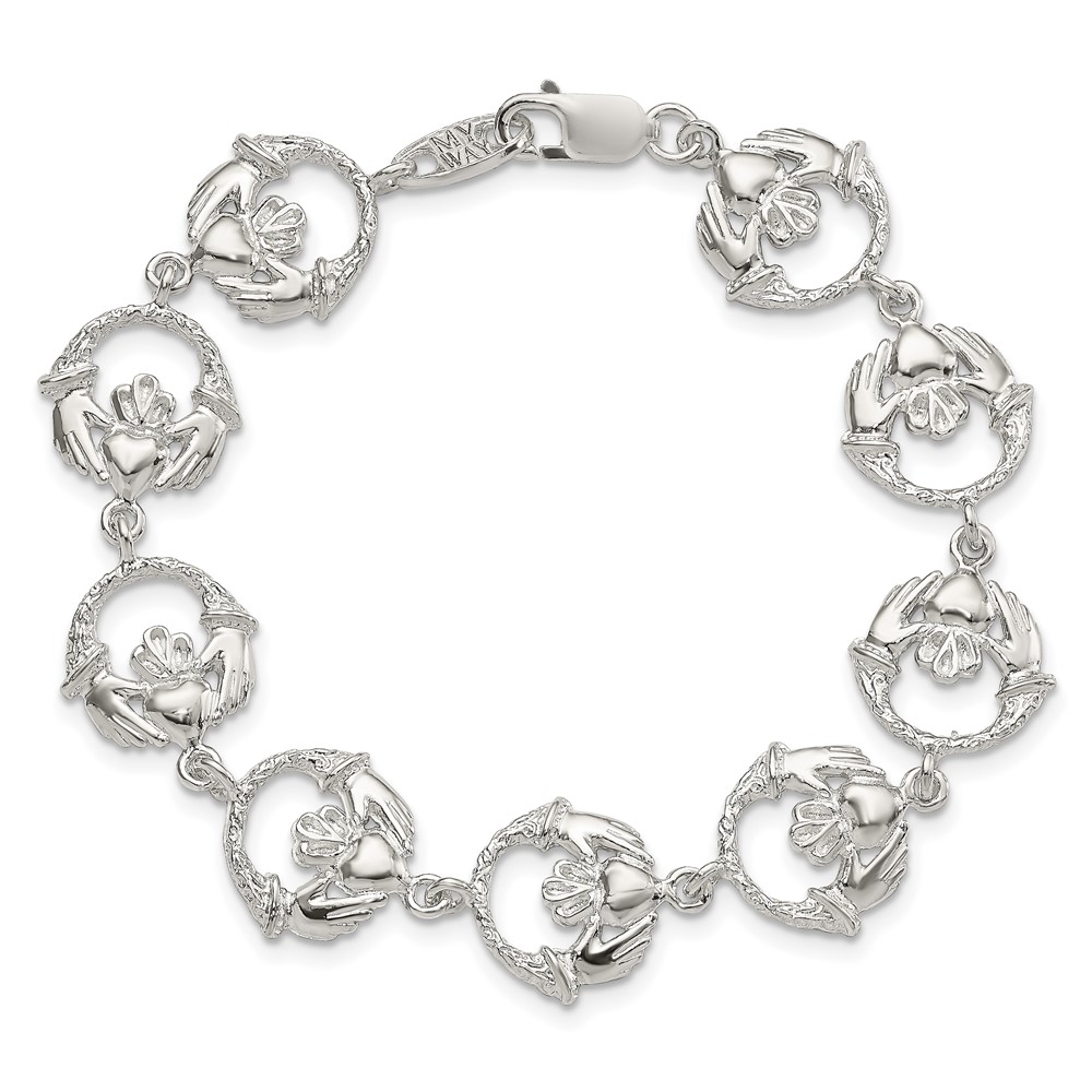 Sterling Silver Polished and Textured Claddagh Link 7 inch Bracelet