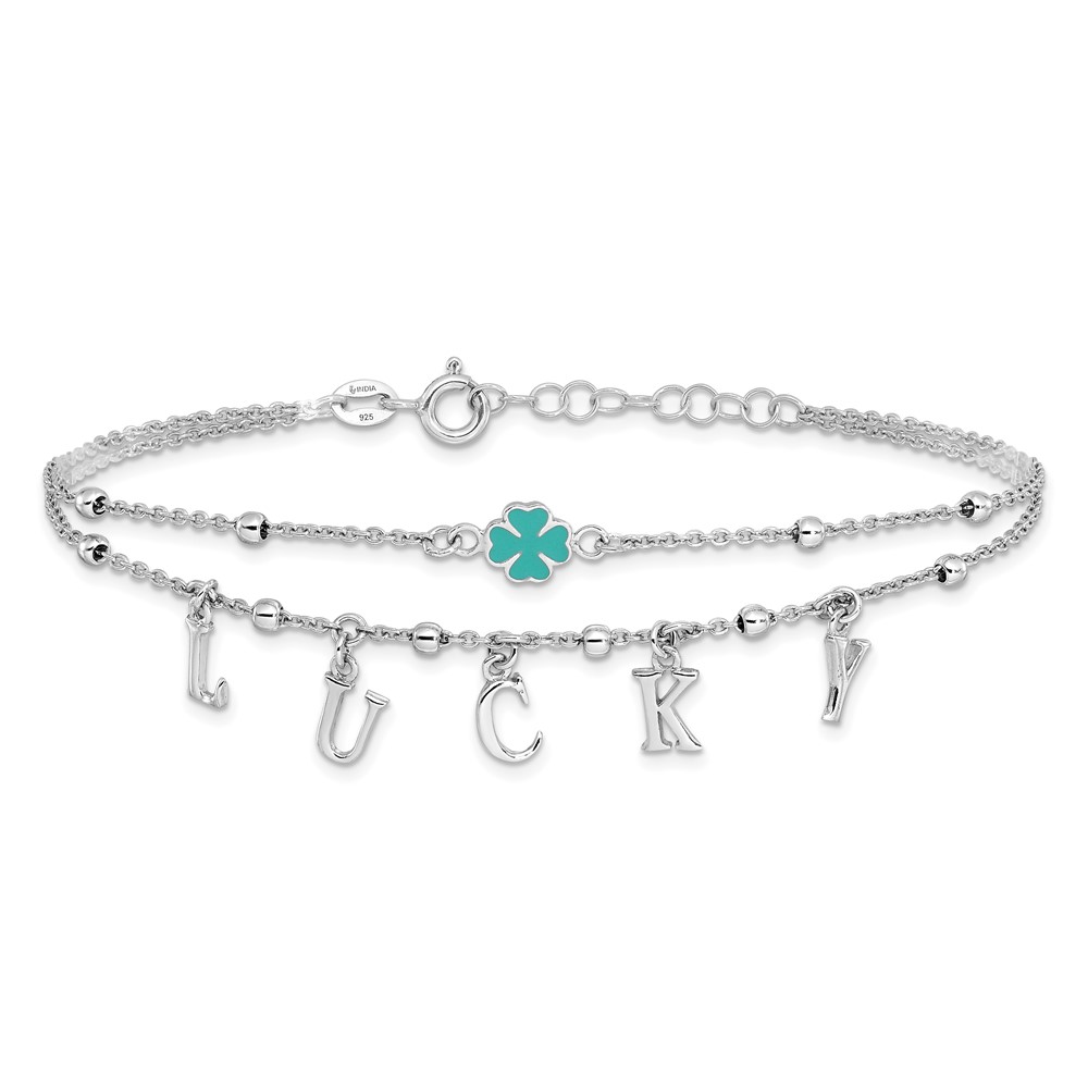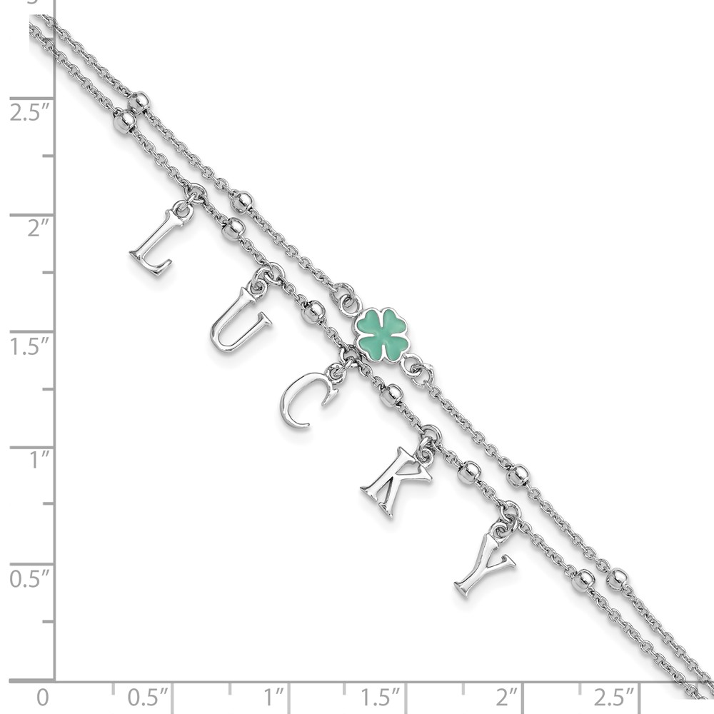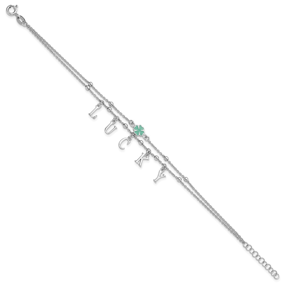 Sterling Silver Rhod-pltd Enamel Clover LUCKY 7.25in w/1in ext Bracelet
