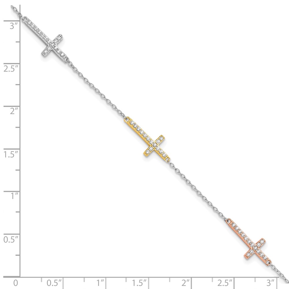 Sterling Silver Rhod-plated Gold/Rose-tone CZ Cross w/1in ext. Bracelet
