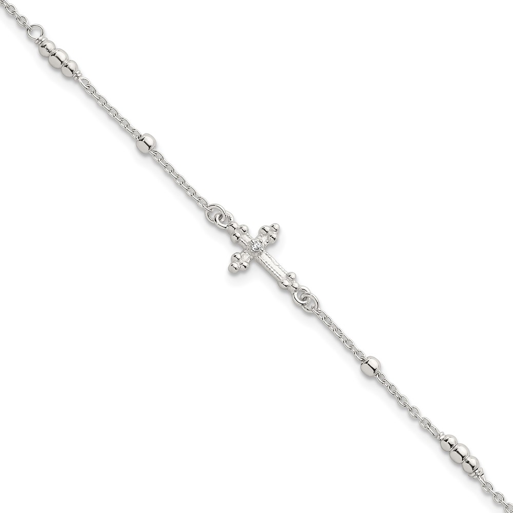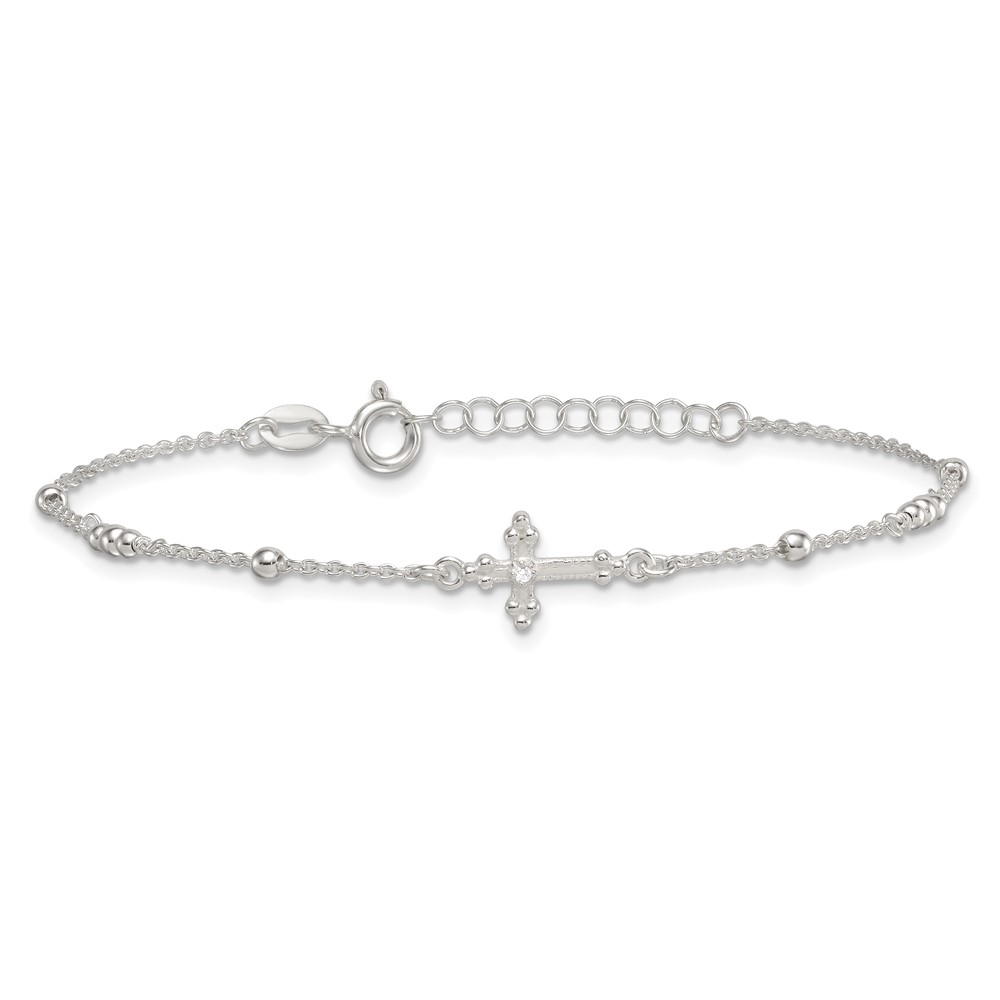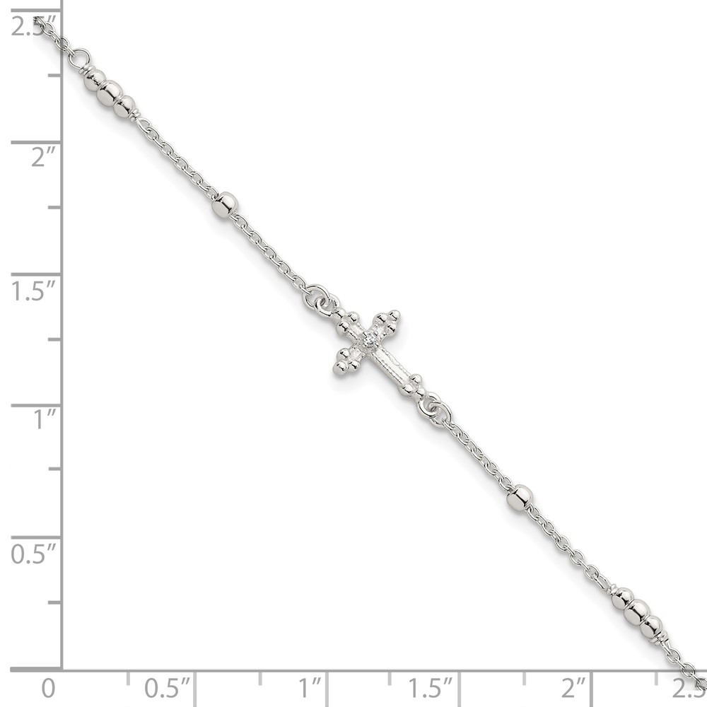 Sterling Silver Polished and Beaded White CZ Budded Cross 7 inch with 1 inch Extension Bracelet
