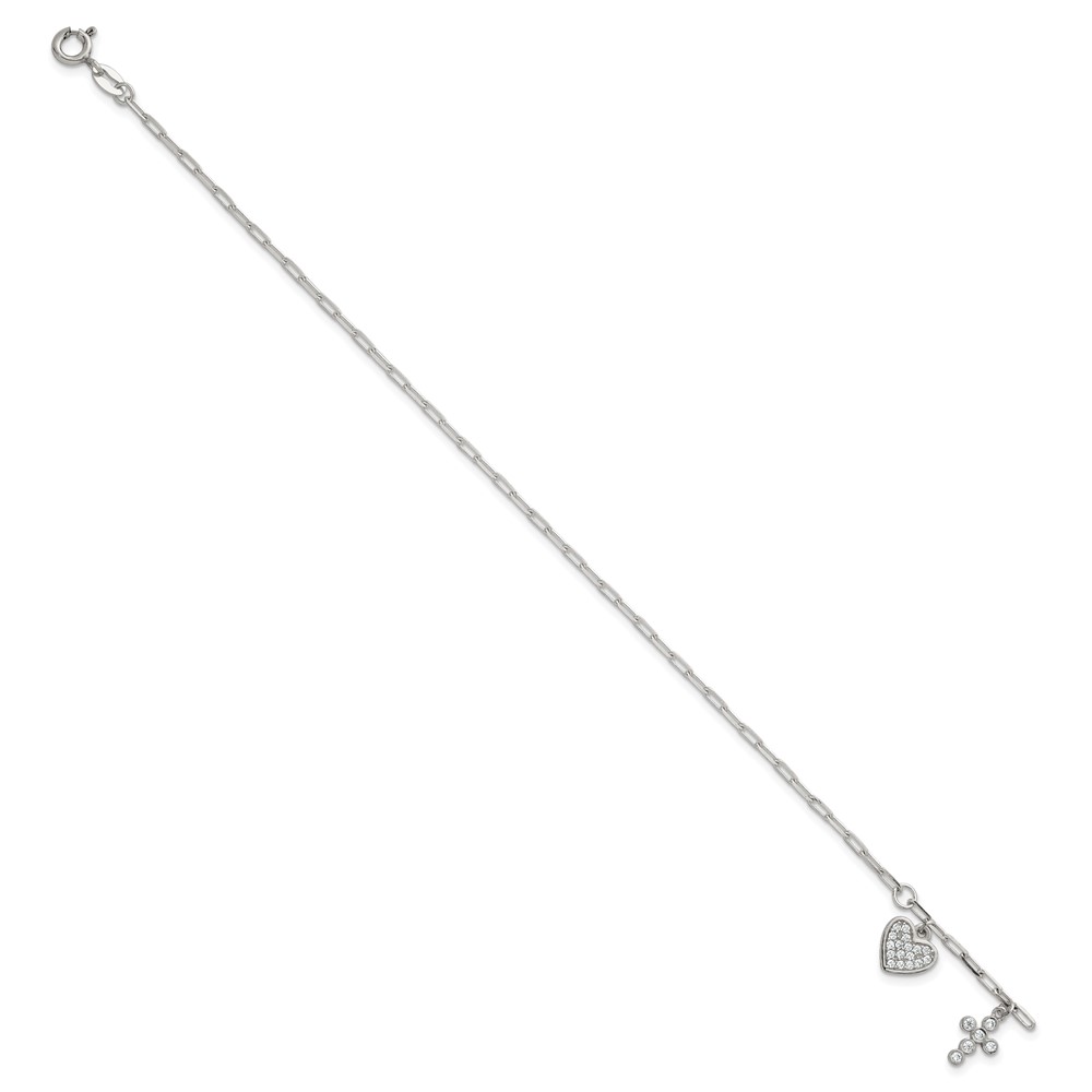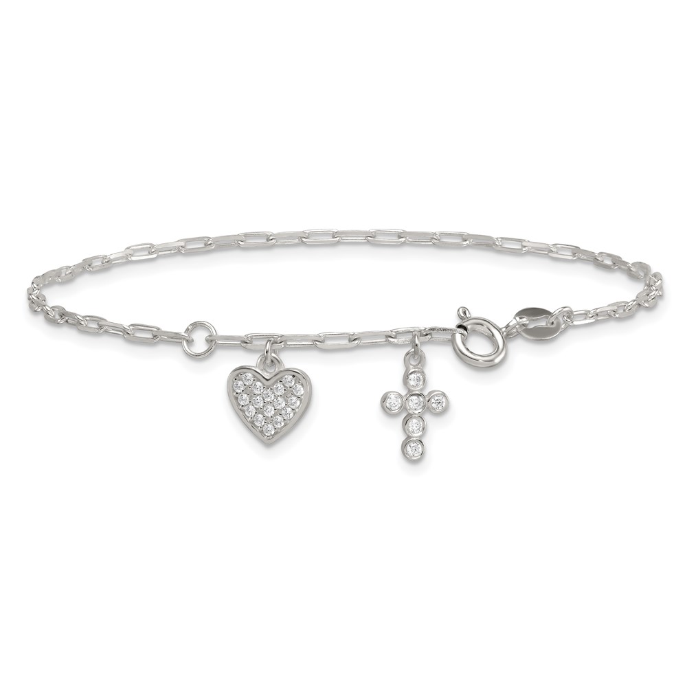 Sterling Silver Polished White CZ Heart and Cross Charms 7 inch with 1 inch Extension Bracelet