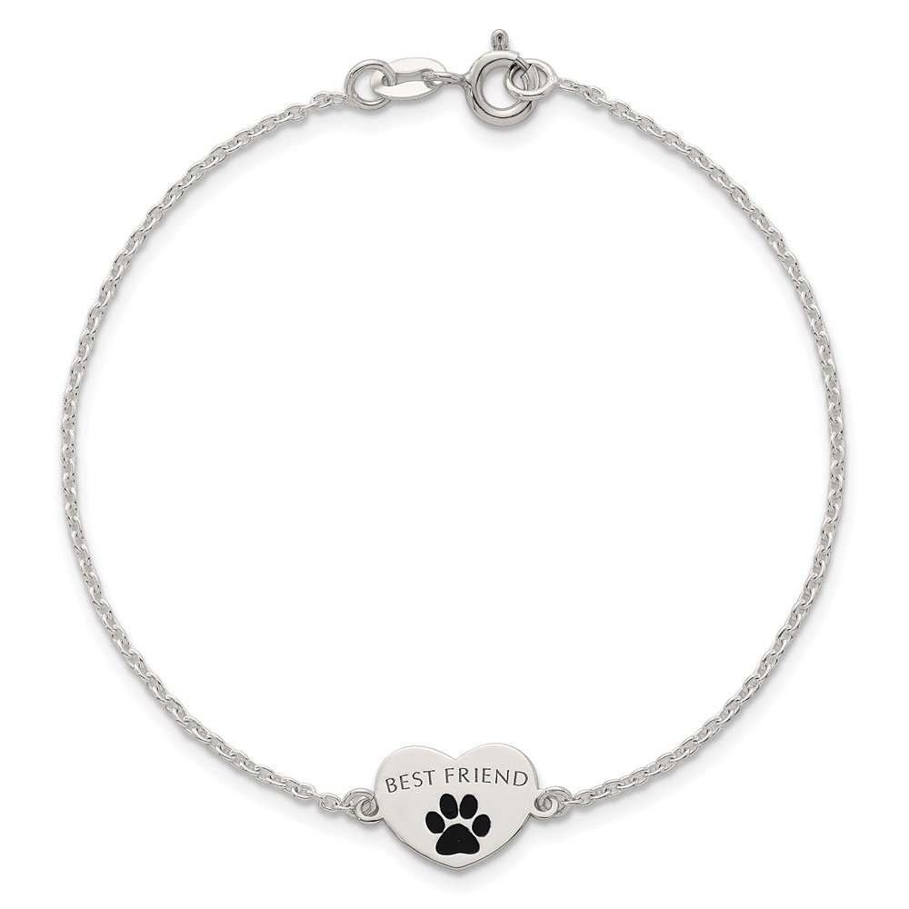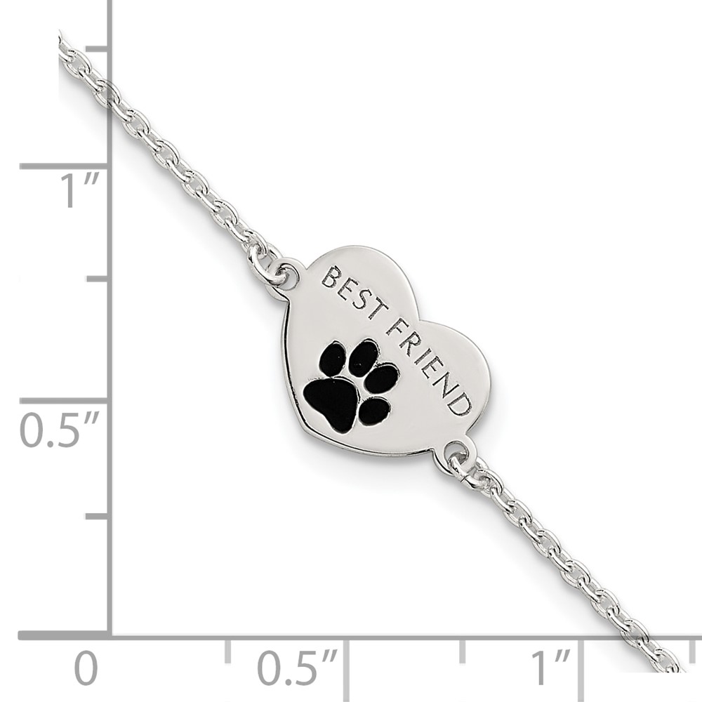 Sterling Silver Polished Black Enamel Pawprint Heart BEST FRIEND 7.5 inch Bracelet