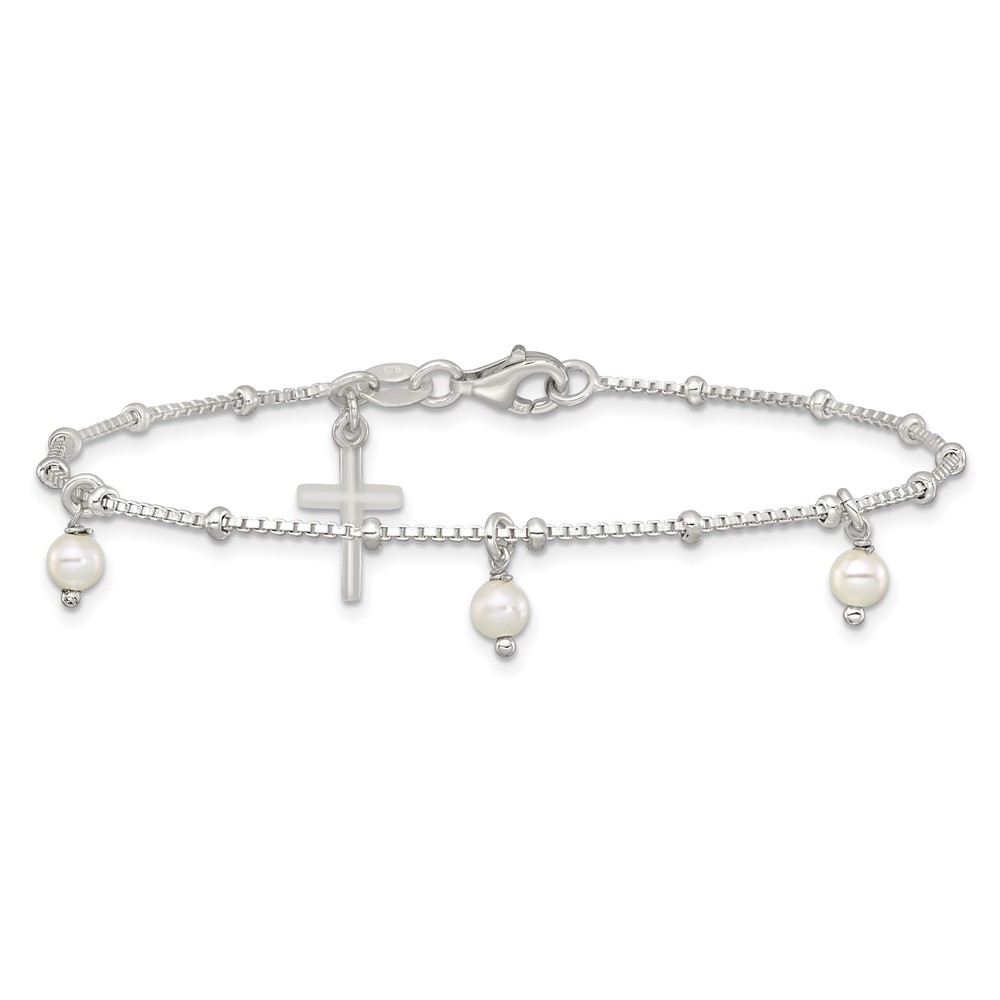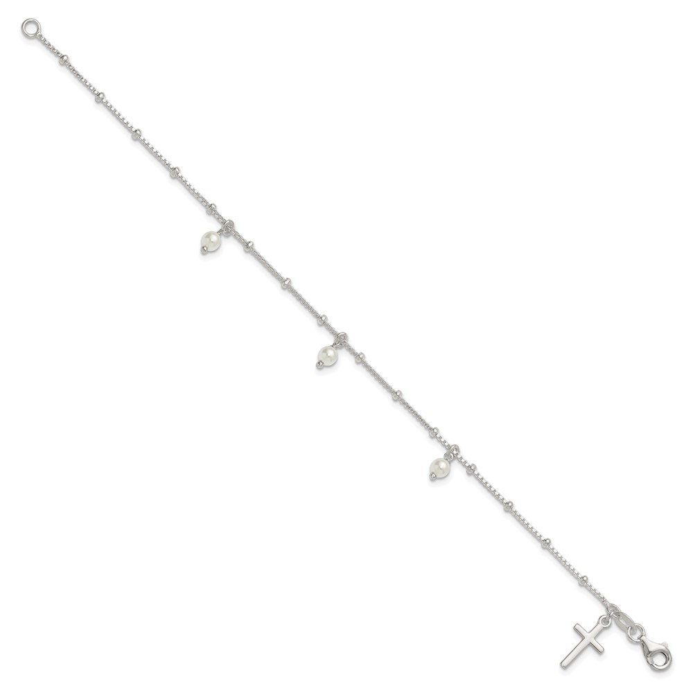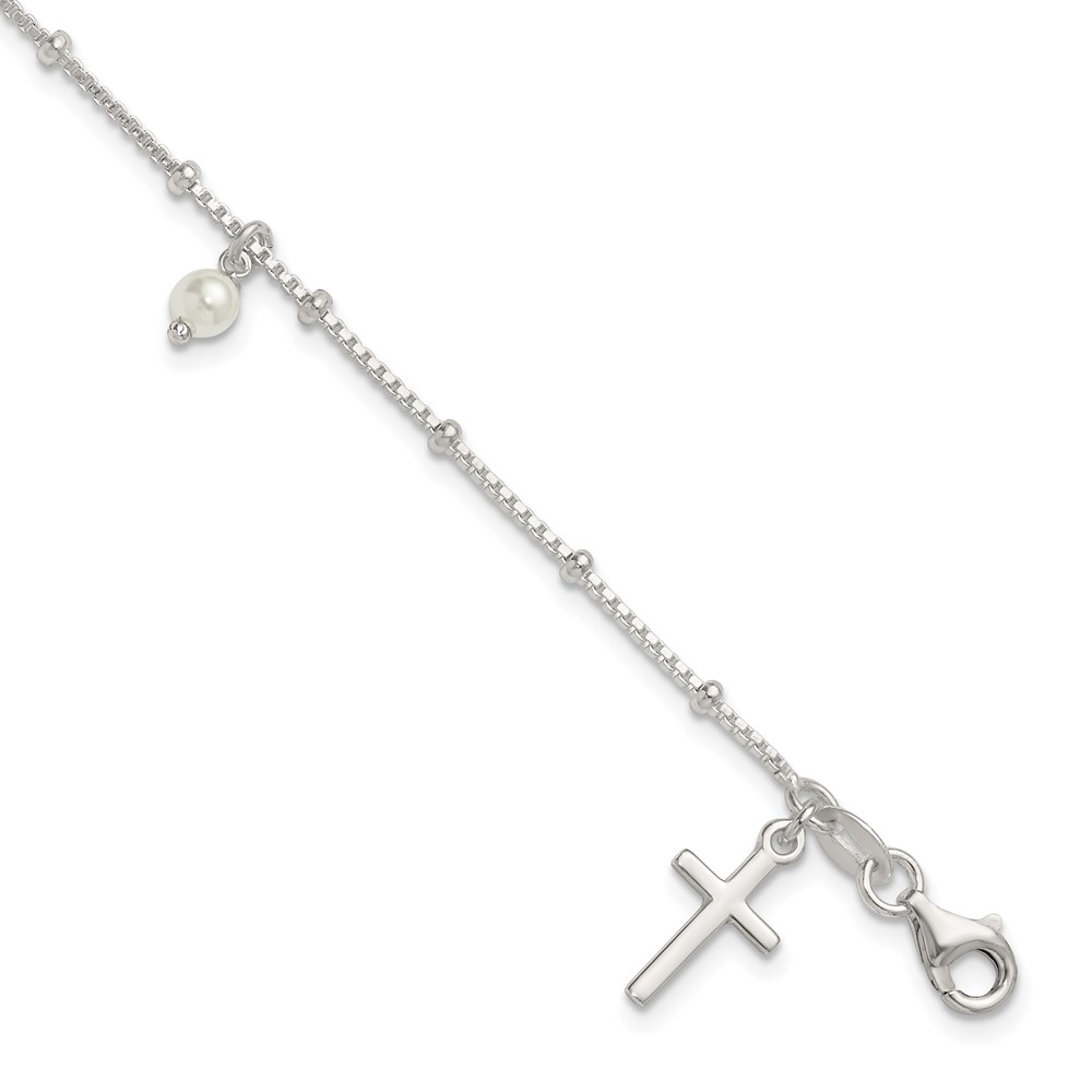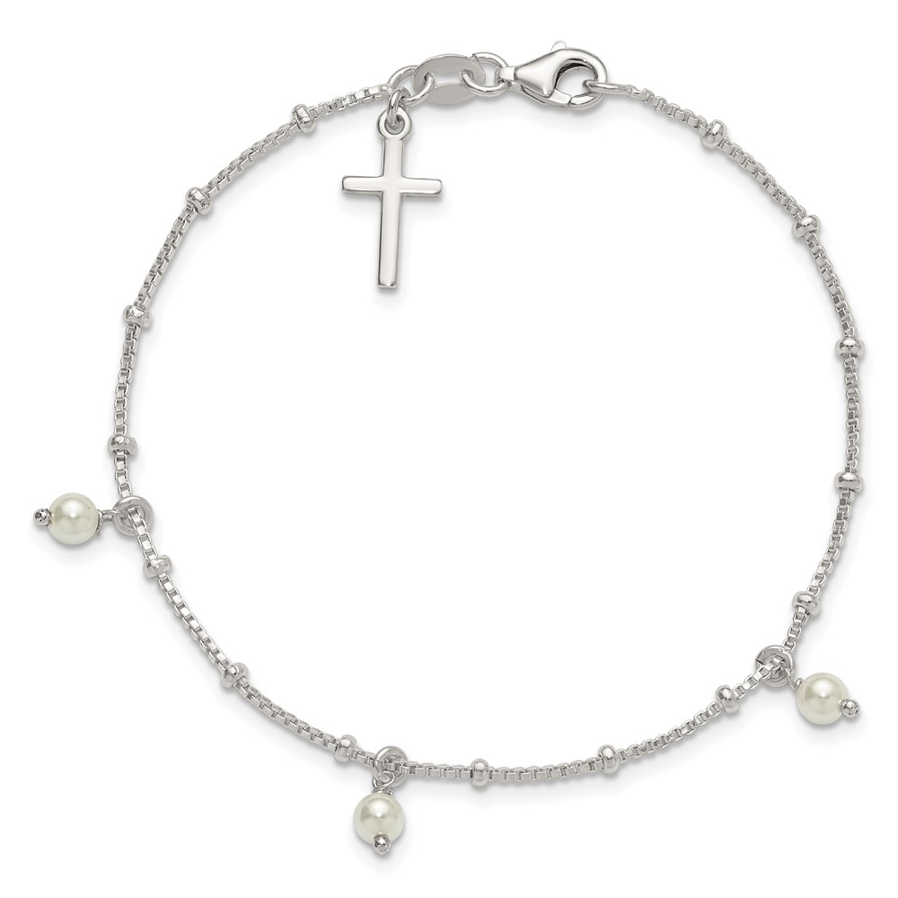 Sterling Silver Polished and Beaded with Glass Pearls and Cross Charm 7.5 inch Bracelet
