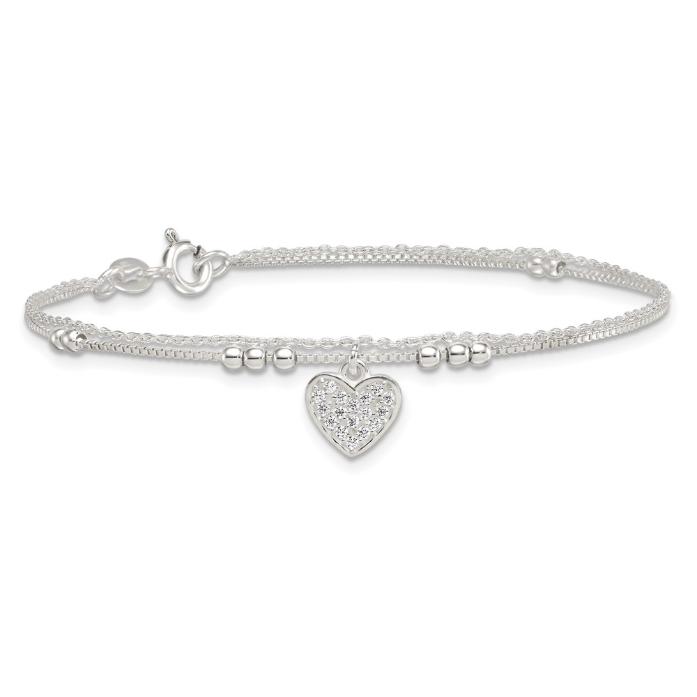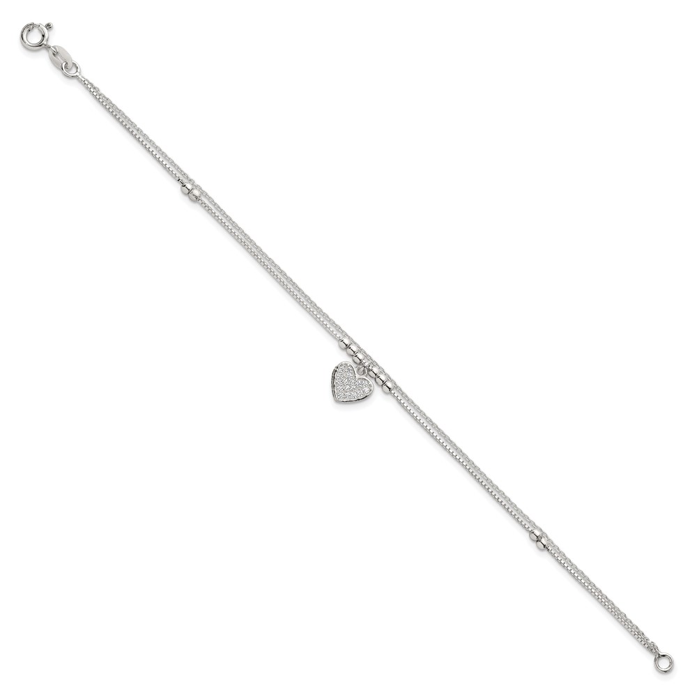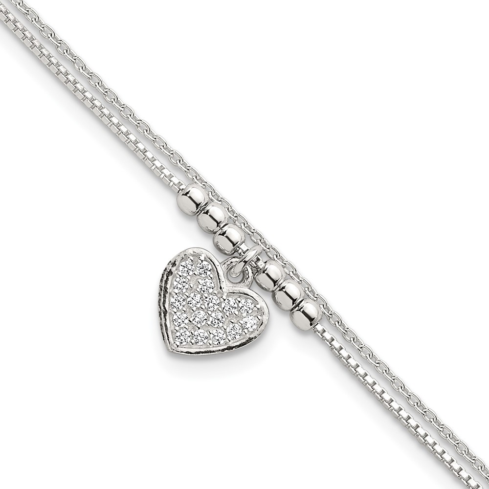 Sterling Silver Polished and Beaded with White CZ Heart Double Strand 7.5 inch Bracelet