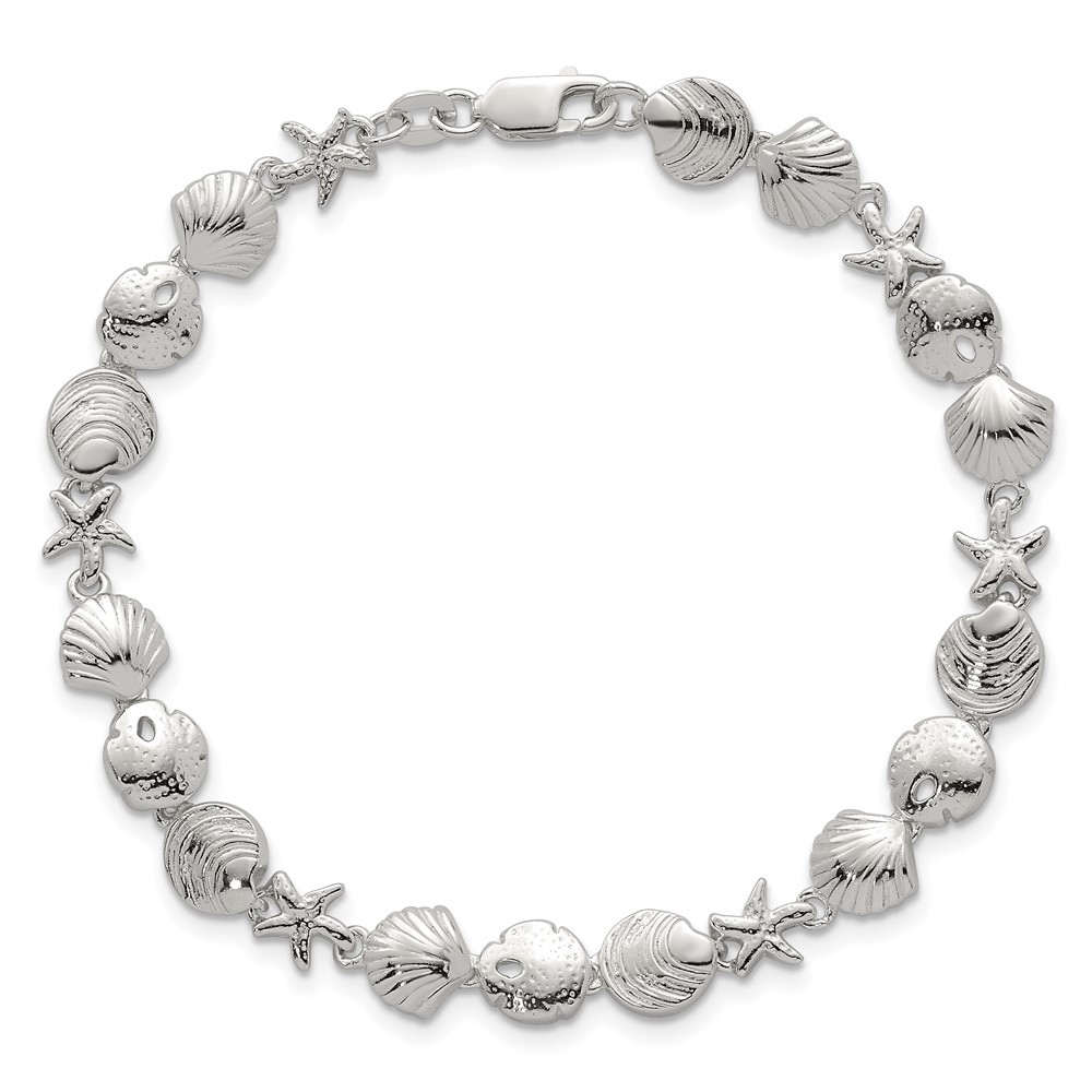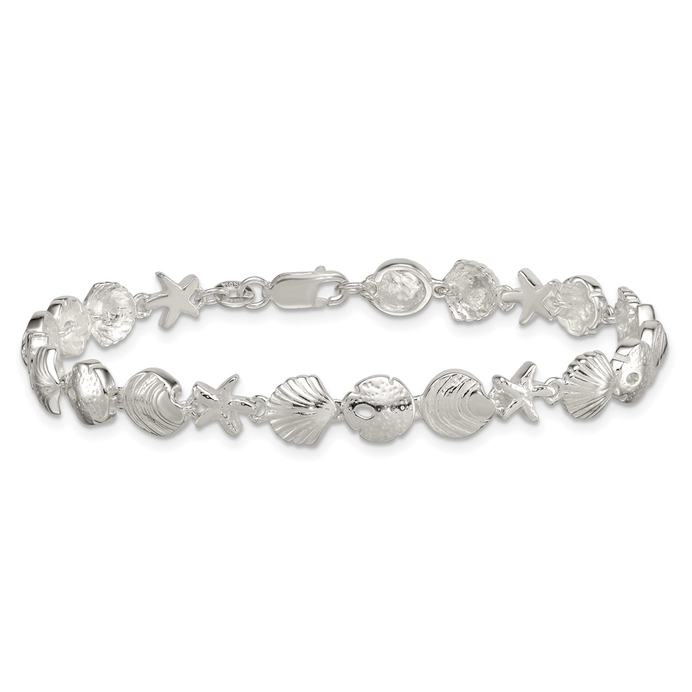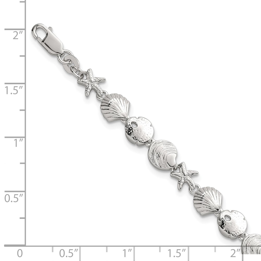 "Sterling Silver Polished Textured Starfish, Sand Dollar, and Sea Shell 7.25 inch Bracelet"
