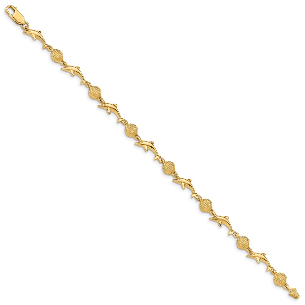 14K Polished Dolphin and Sea Shell 7 inch Bracelet