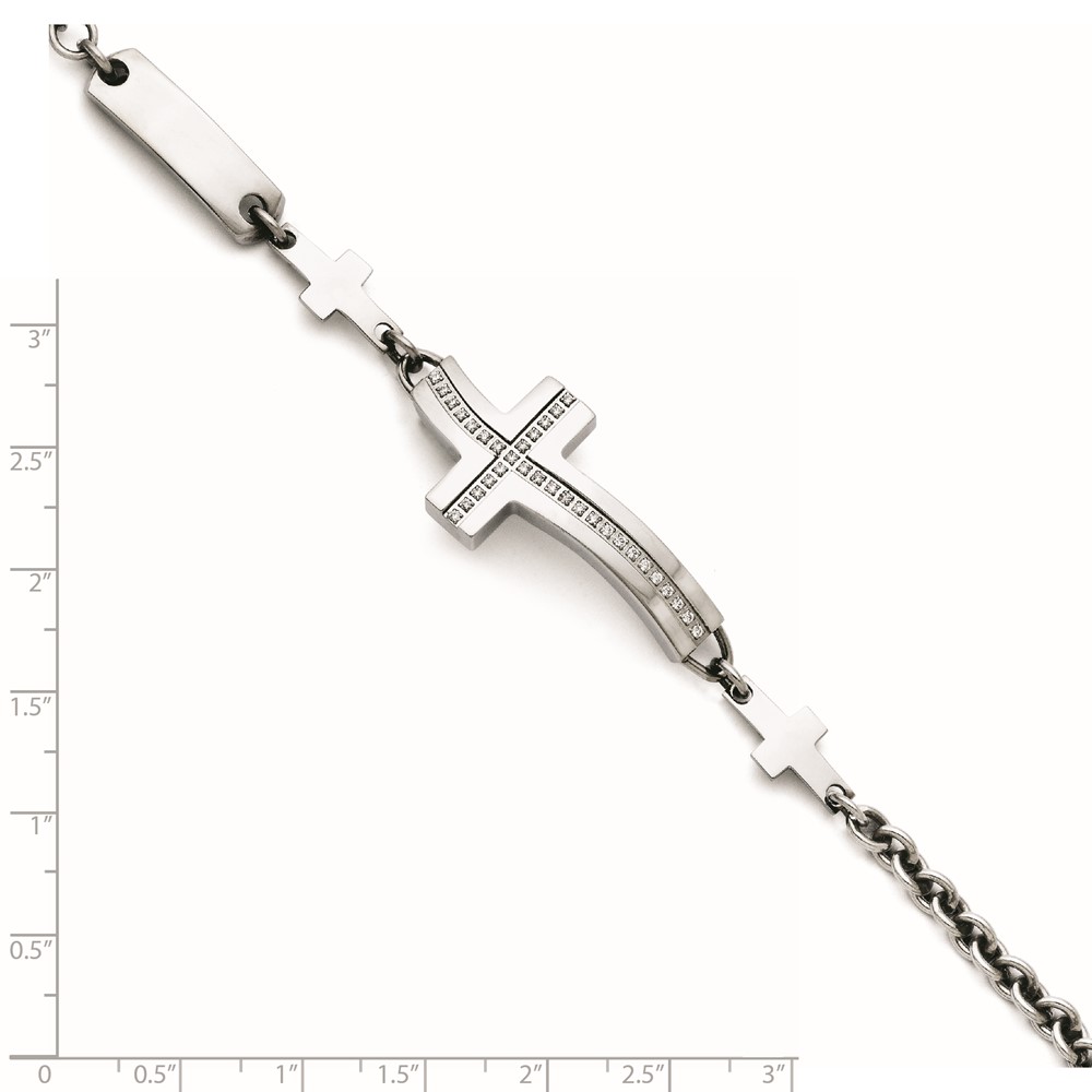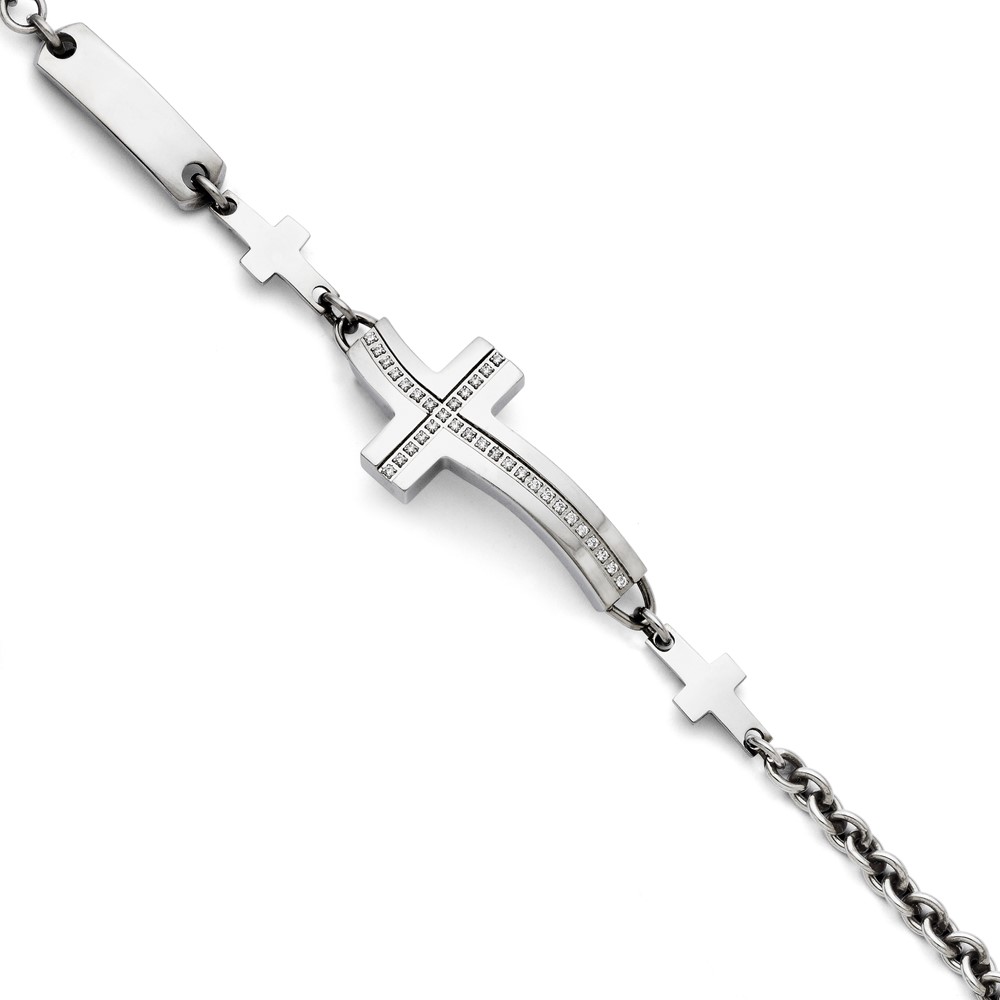 Stainless Steel Polished Wavy CZ Sideways Cross Bracelet