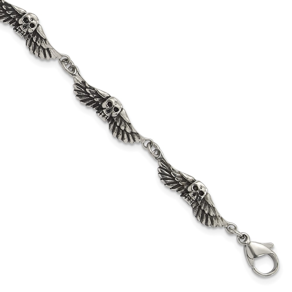 Stainless Steel Antiqued Skulls with Wings Bracelet