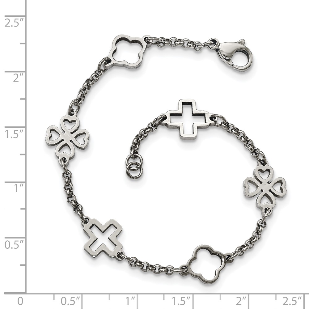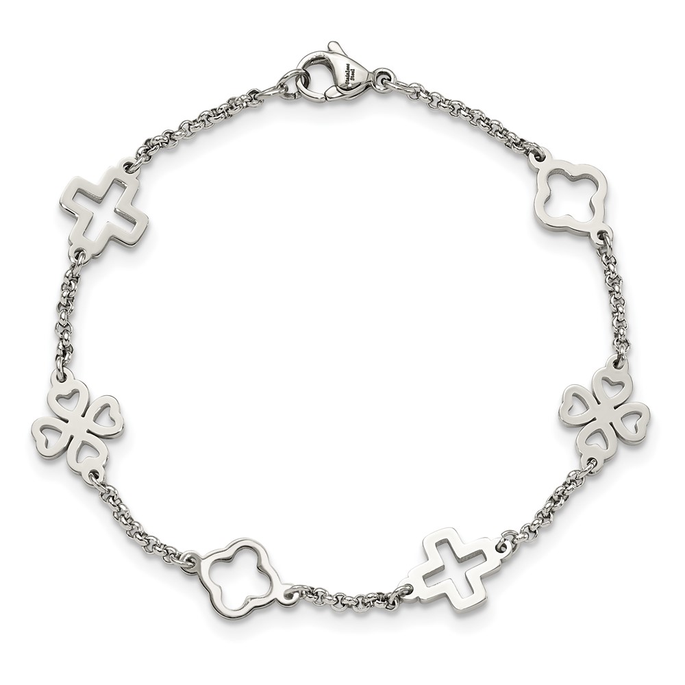 Chisel Stainless Steel Polished Cross and Clovers 7.5 inch Bracelet