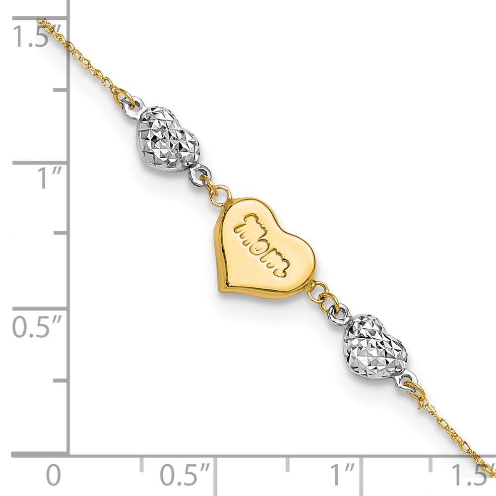 14K Two-tone Puffed MOM Heart and Diamond-cut Beads 7 inch Bracelet Plus 1 inch Heart Dangle Extender
