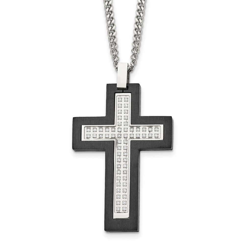 Chisel Stainless Steel Brushed and Polished Black IP -plated Edges CZ Cross Pendant on a 24 inch Cable Chain Necklace