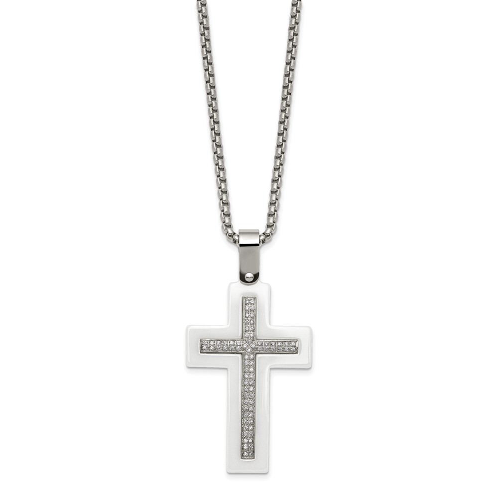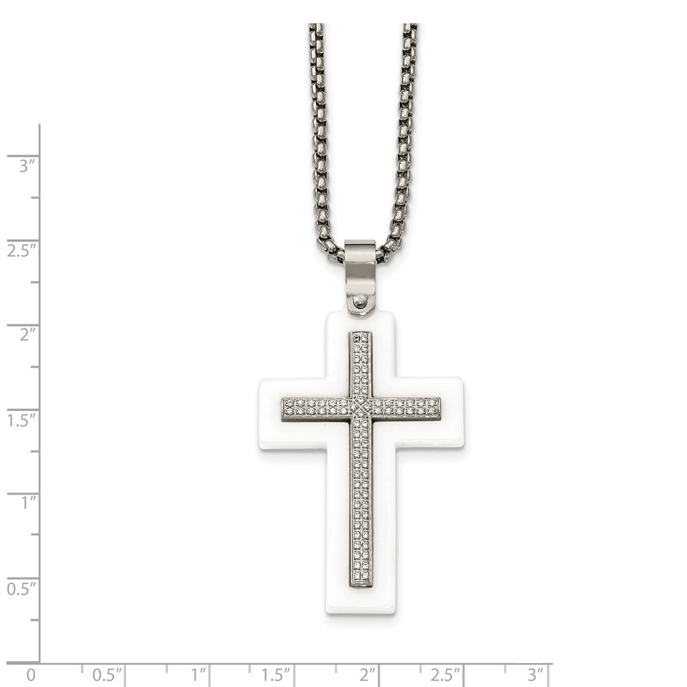 Stainless Steel Polished White Ceramic w/CZ Cross 23.75in Necklace
