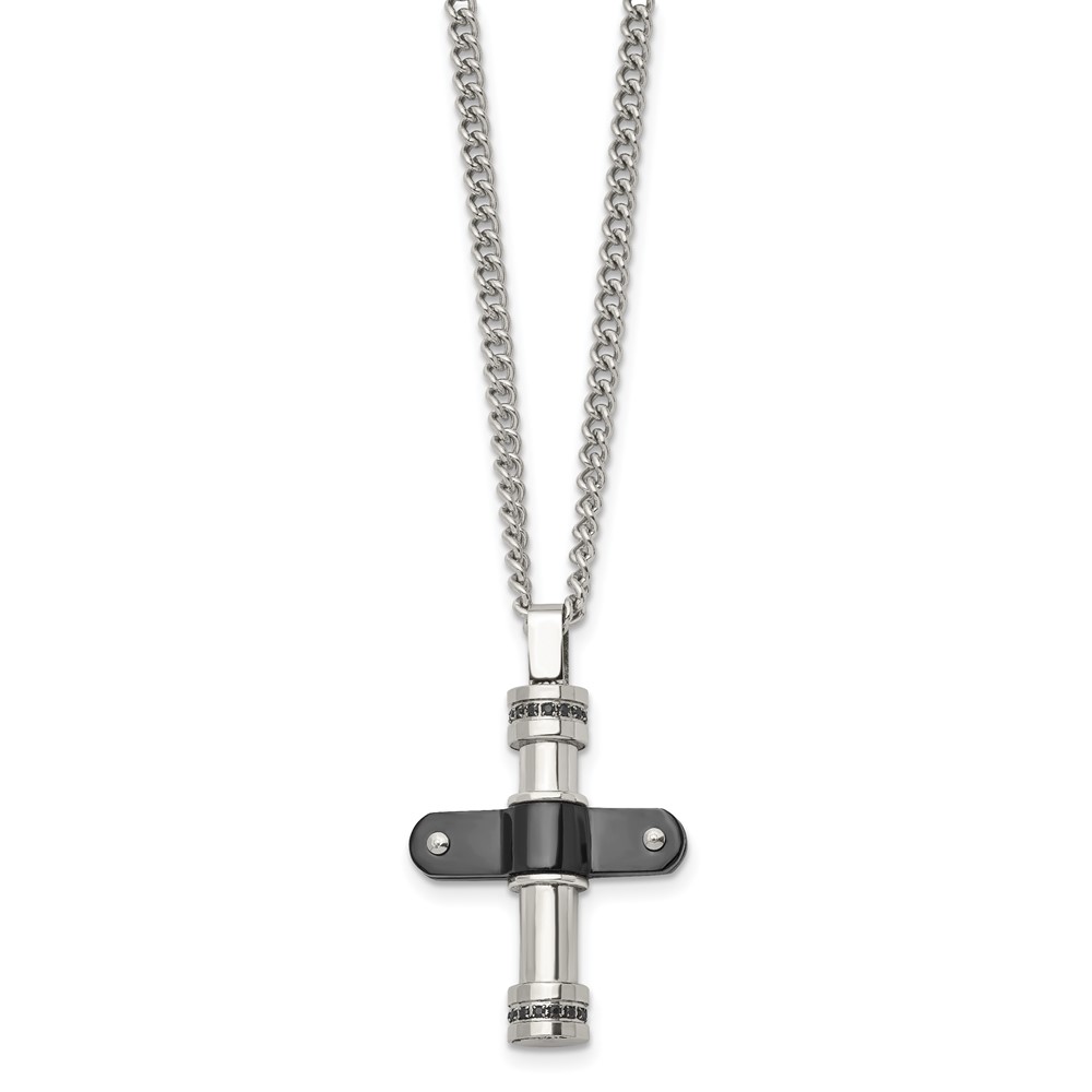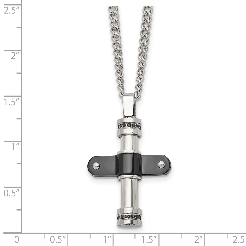 Stainless Steel Polished Black IP-plated w/Black CZ Cross 22in Necklace
