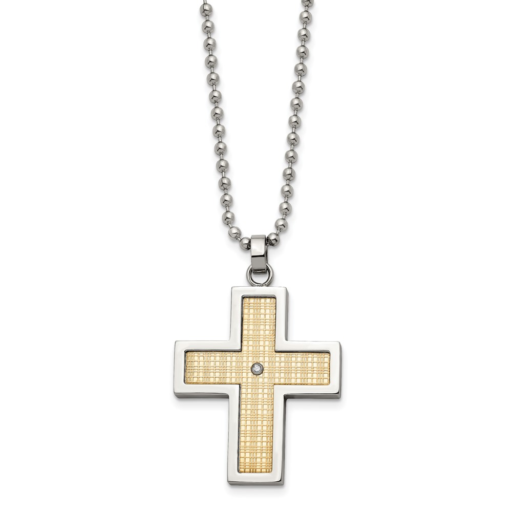 Chisel Stainless Steel Polished with 18k Gold Accent .02 carat Diamond Cross Pendant on a 24 inch Ball Chain Necklace