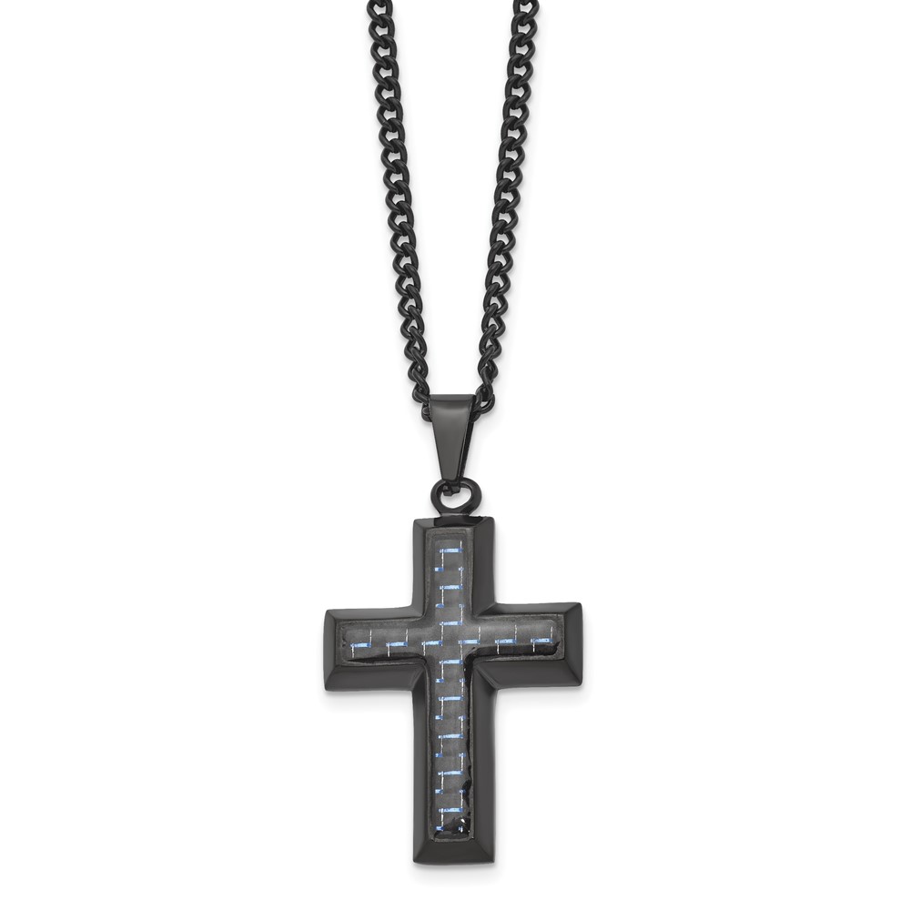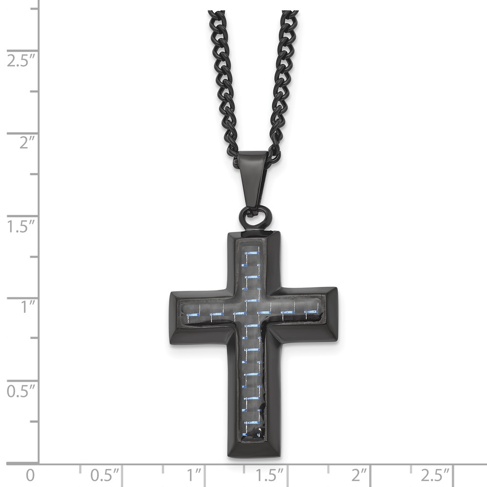 Chisel Stainless Steel Polished Black IP-plated with Blue Carbon Fiber Inlay Cross Pendant on a 24 inch Curb Chain Necklace