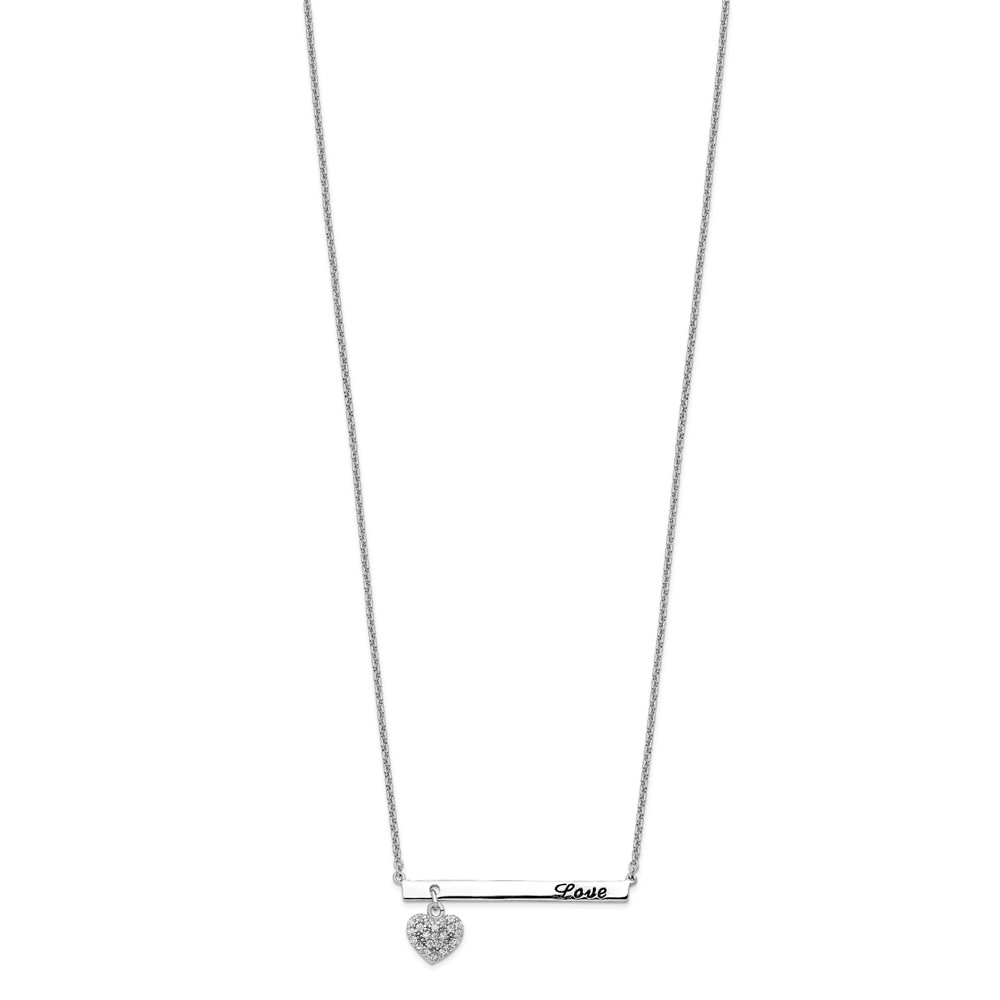 Sterling Silver Rhodium Plated Antiqued LOVE Bar with CZ Heart Dangle 16 inch Necklace