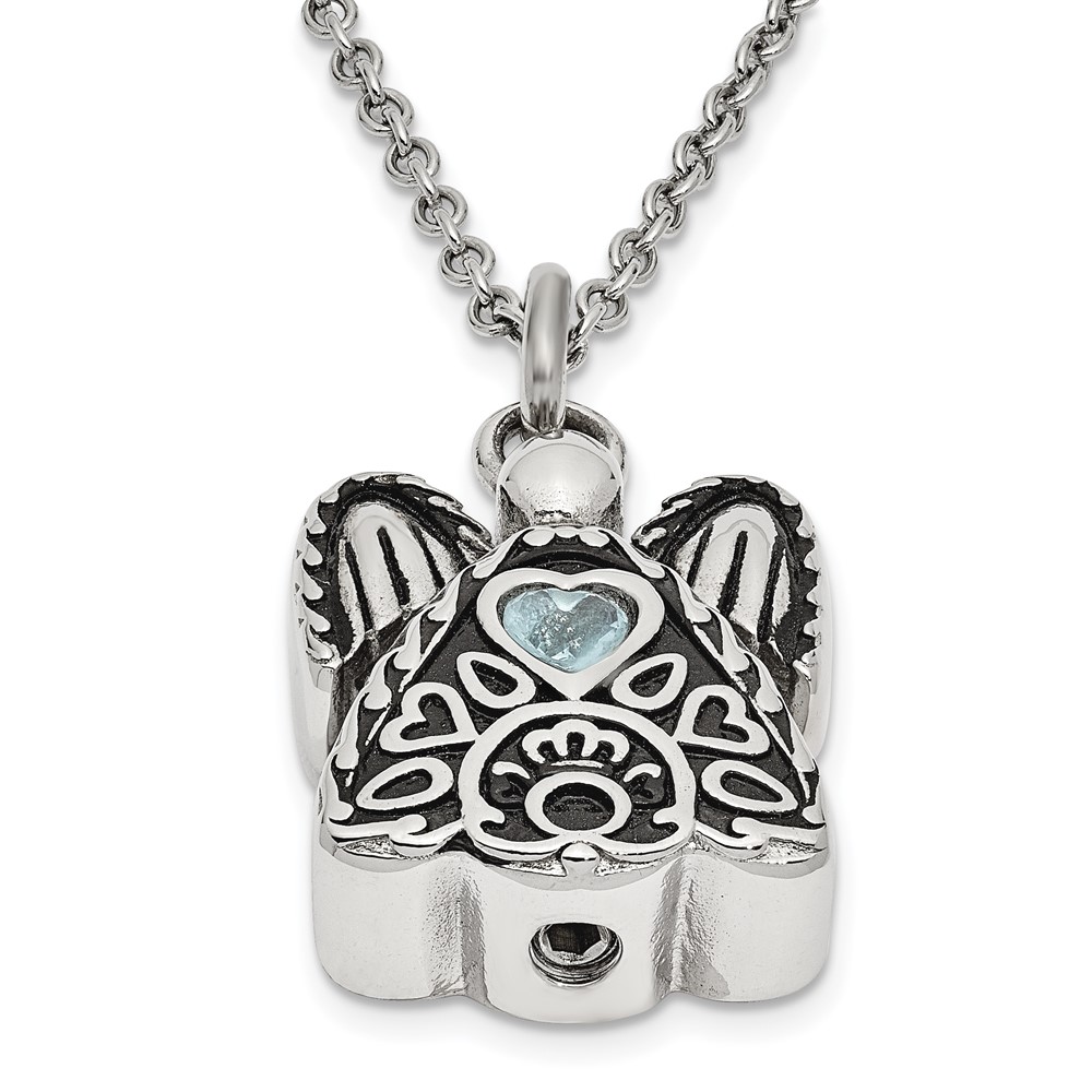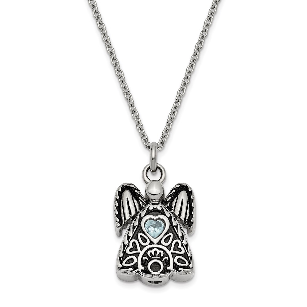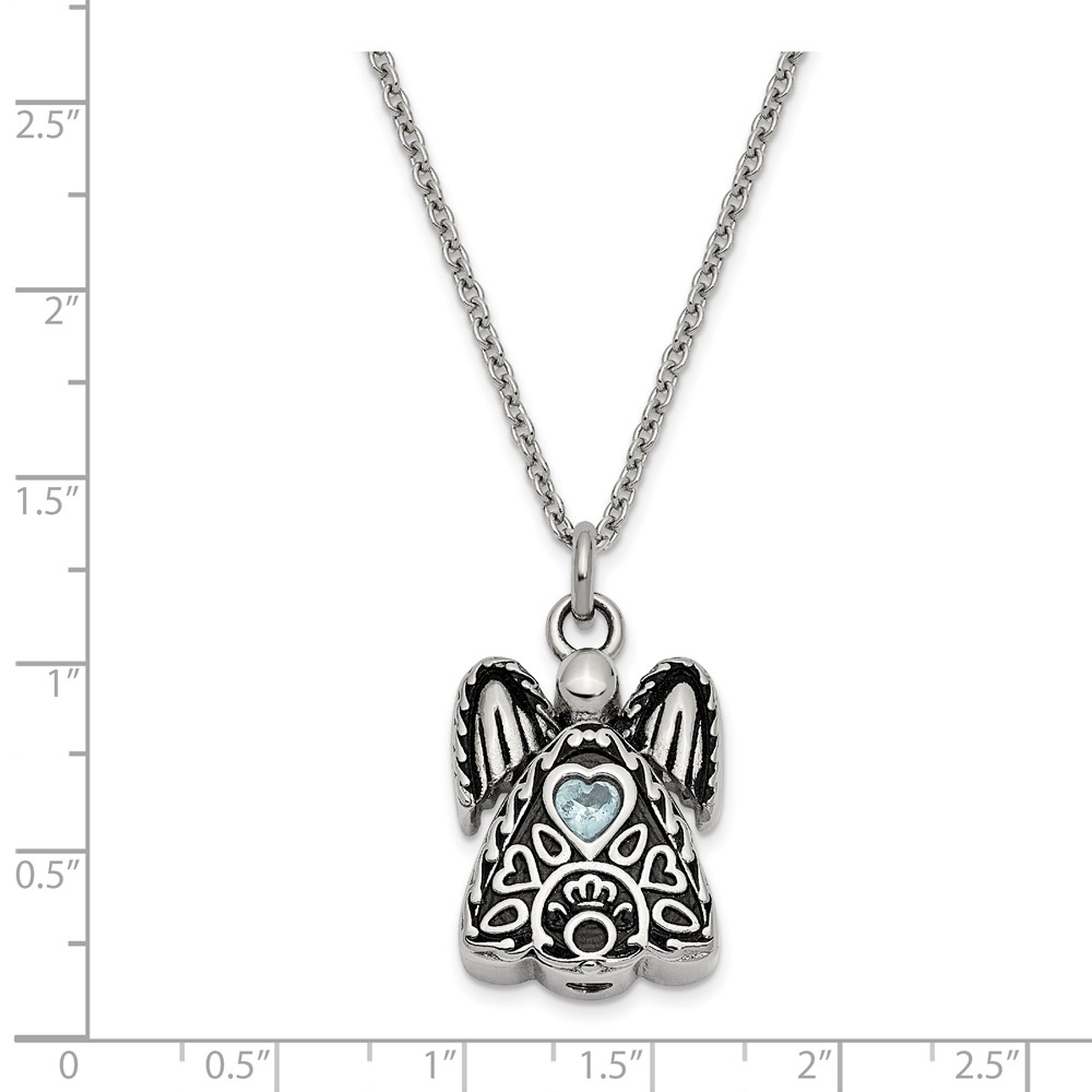 Sentimental Expressions Stainless Steel Light Blue CZ March Birthstone Antiqued Angel Ash Holder 18 inch Necklace