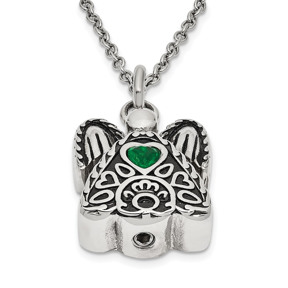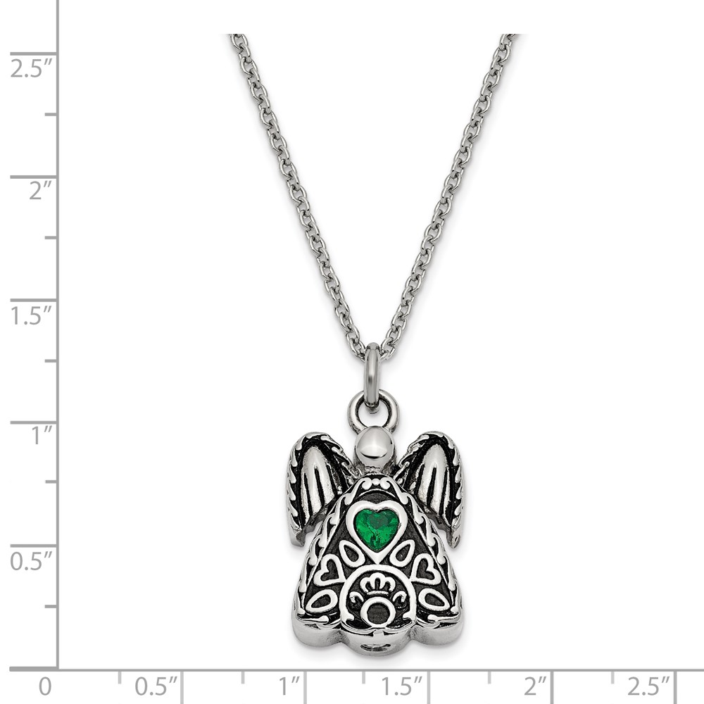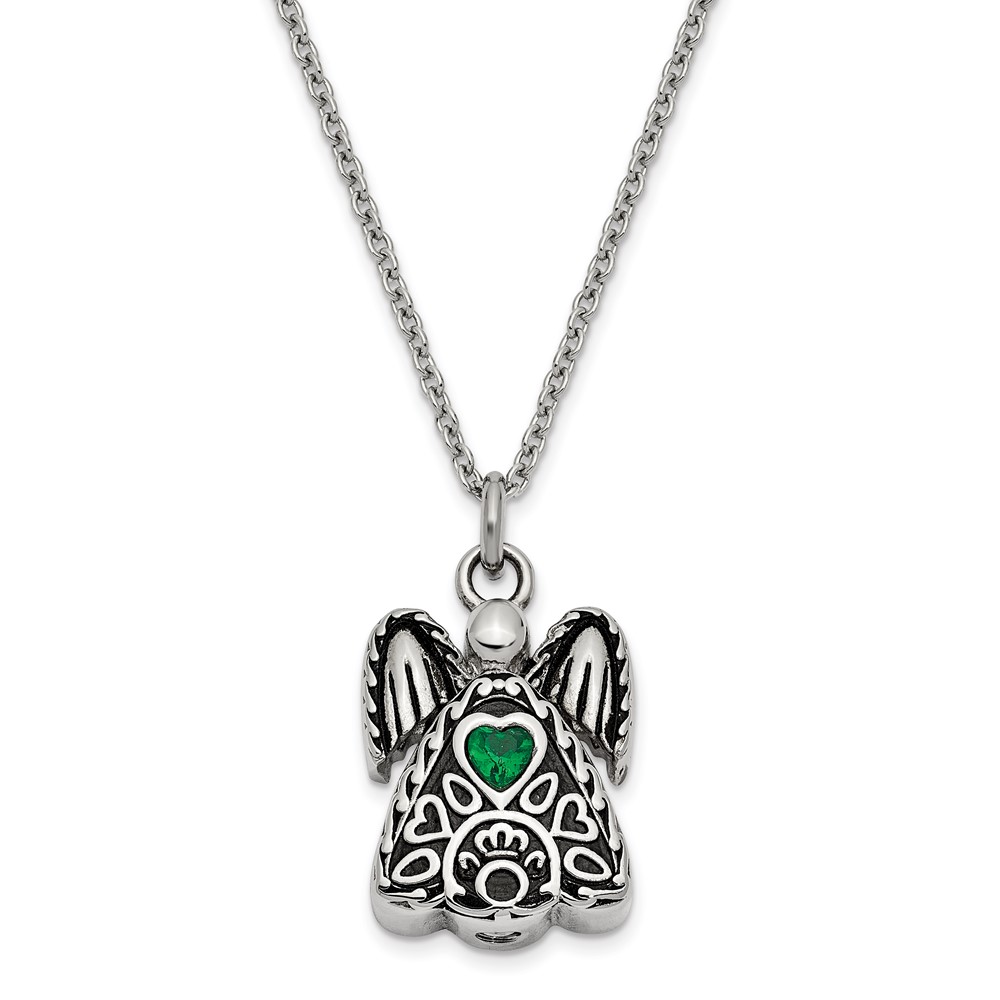 Sentimental Expressions Stainless Steel Green CZ May Birthstone Antiqued Angel Ash Holder 18 Inch Necklace