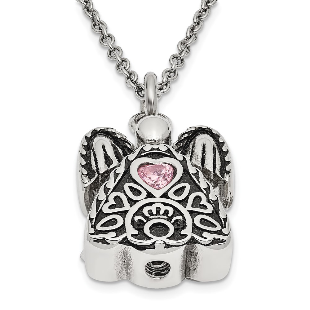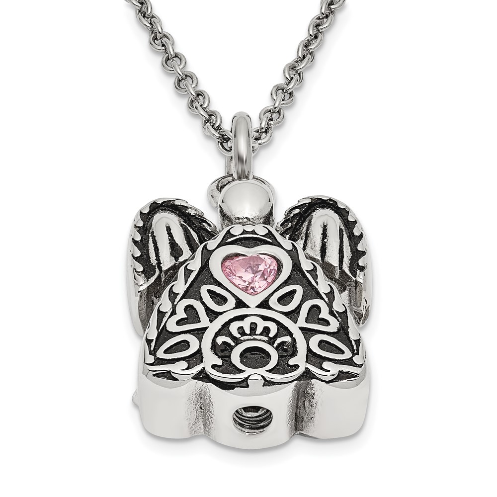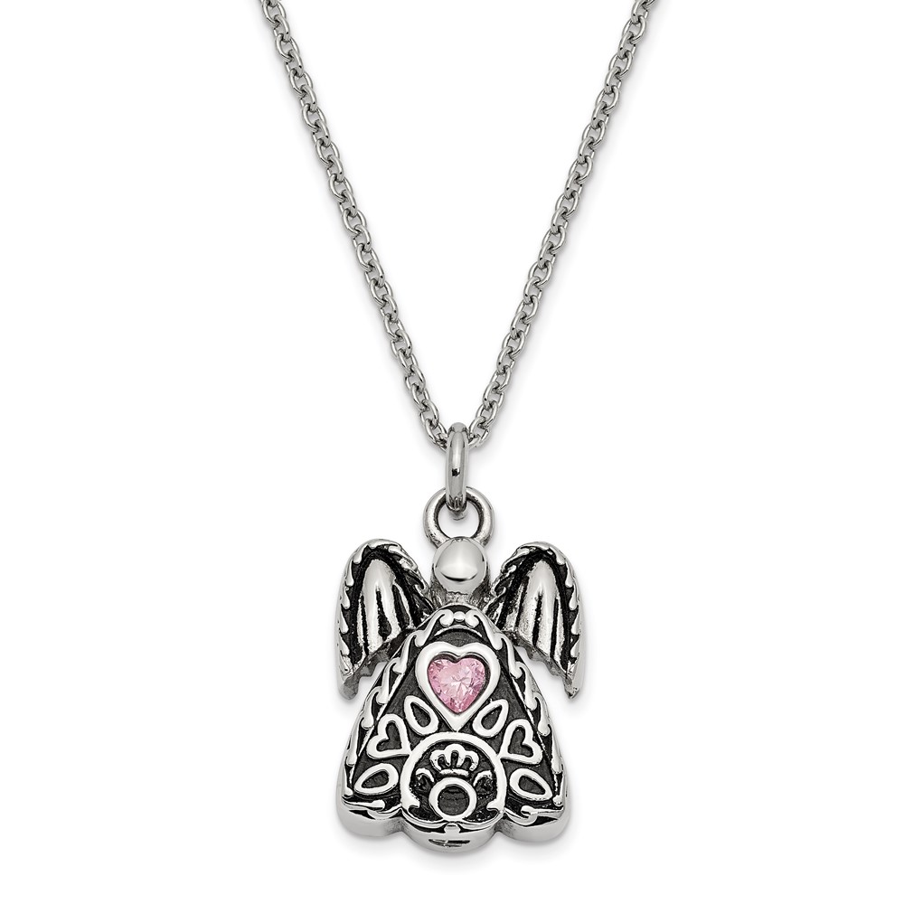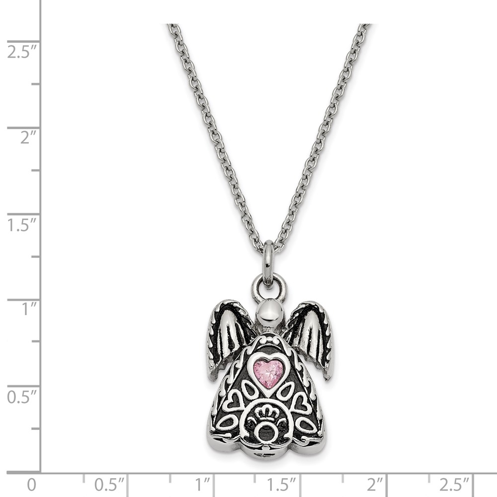 Sentimental Expressions Stainless Steel Pink CZ October Birthstone Antiqued Angel Ash Holder 18 Inch Necklace