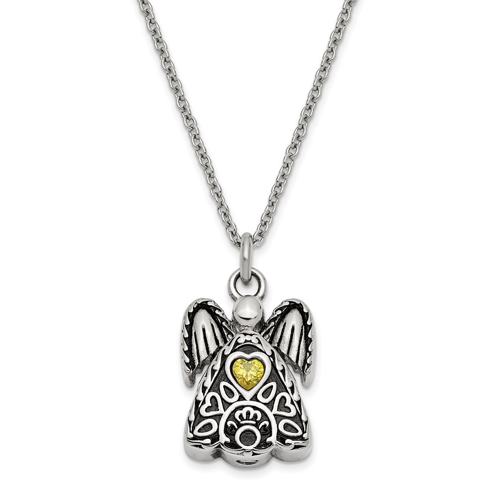 Sentimental Expressions Stainless Steel Yellow CZ November Birthstone Antiqued Angel Ash Holder 18 Inch Necklace