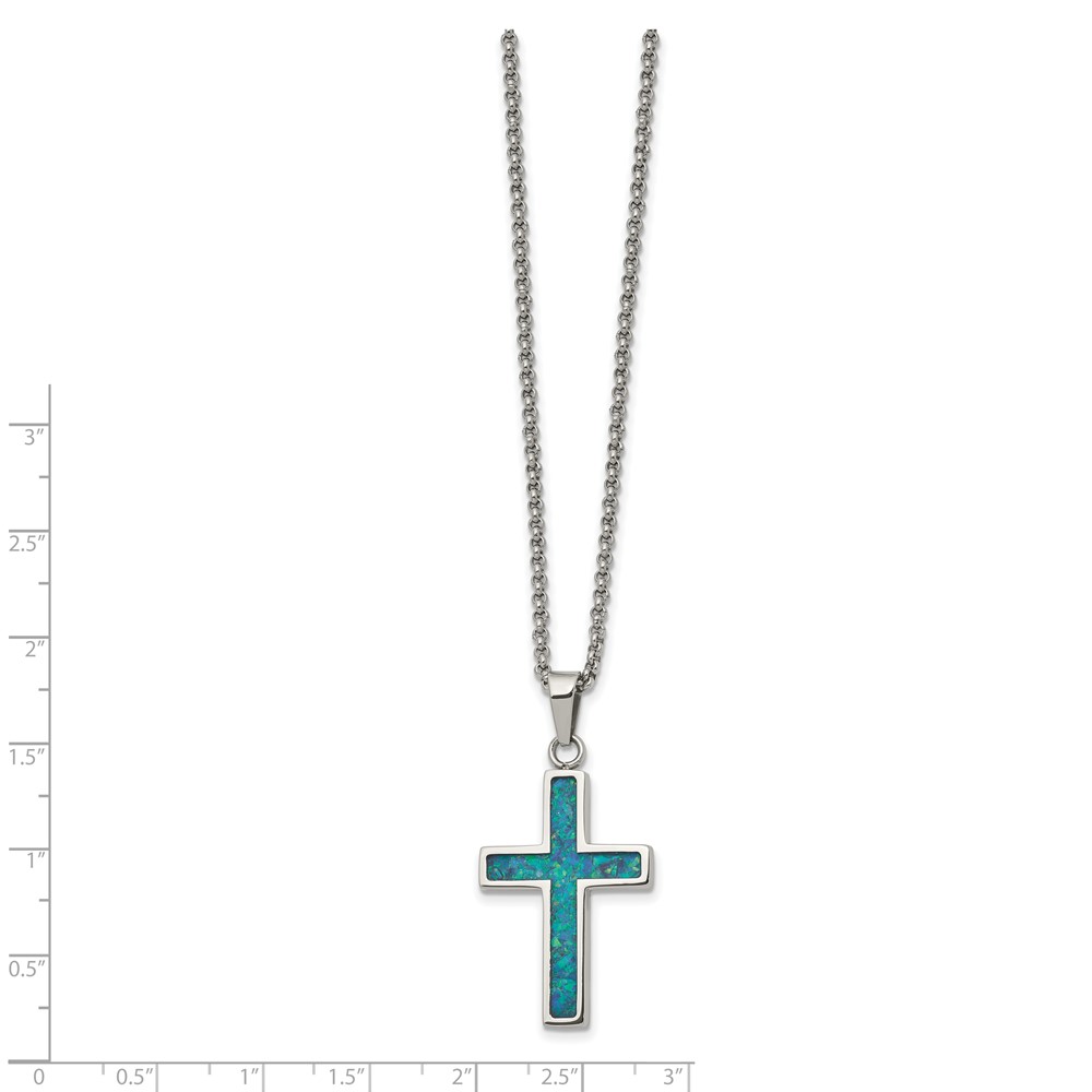 Chisel Stainless Steel Polished with Imitation Opal Small Cross Pendant on a 22 inch Rolo Chain Necklace
