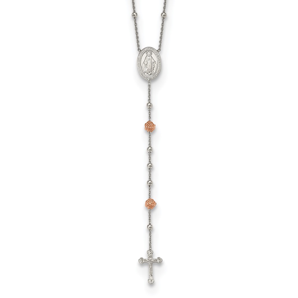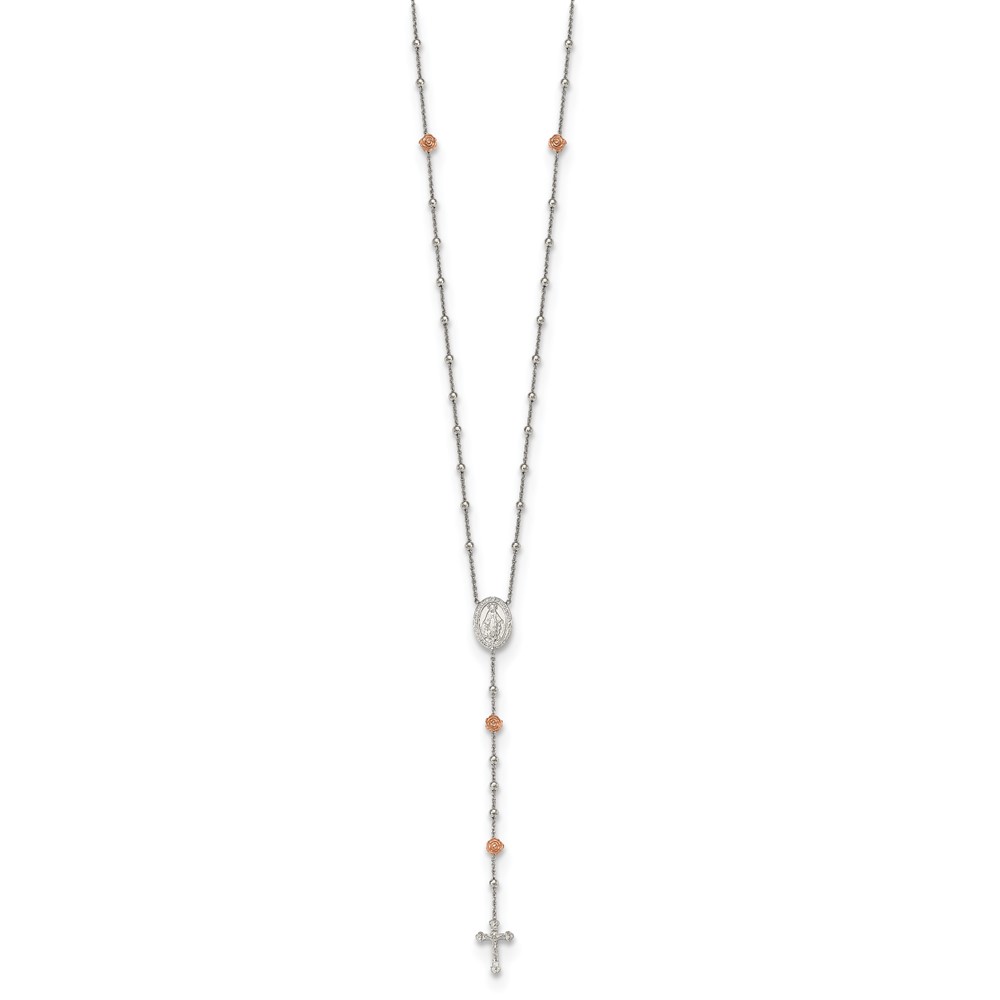 Sterling Silver RH-plated Beaded w/Rose-tone Roses Rosary 21in Necklace