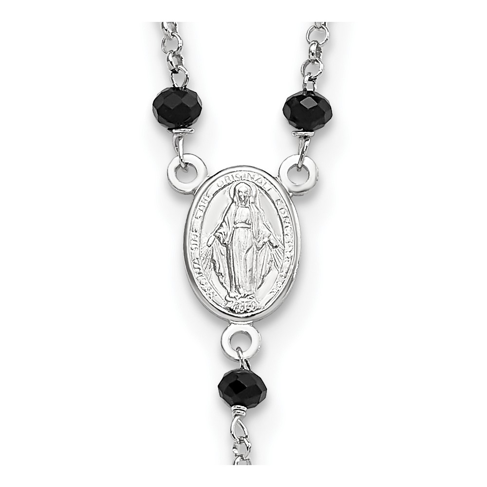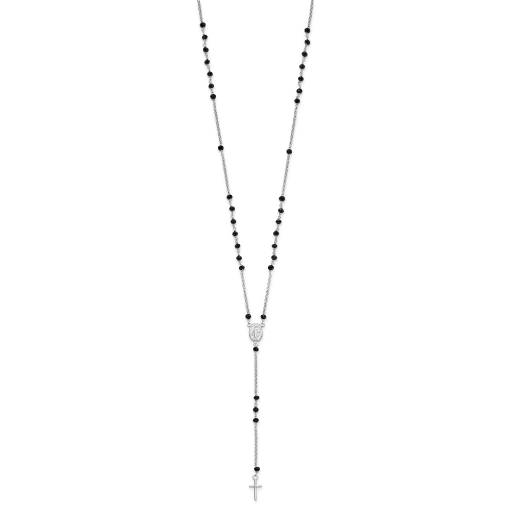 Sterling Silver Rhodium-plated Black Beaded Rosary w/1.25in .ext Necklace