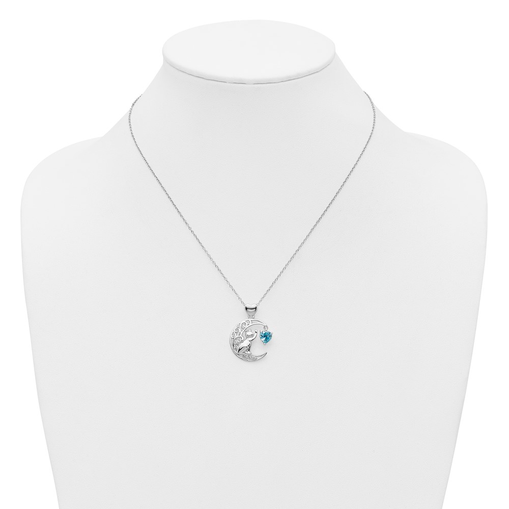 Sterling Silver Blue and Clear CZ Cat and Moon Necklace